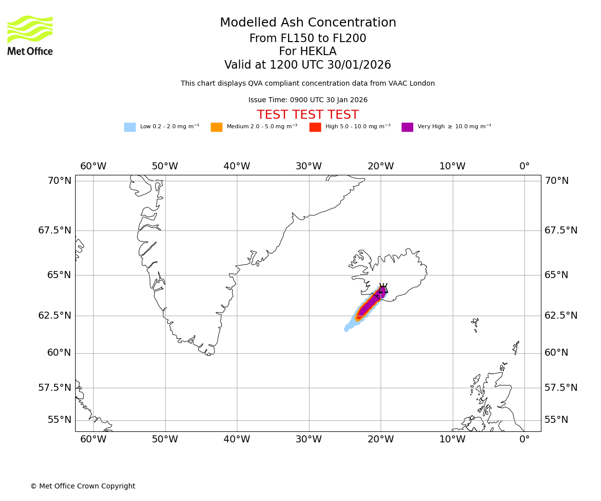 Modelled ash concentration from 150 to 200 for HEKLA. Valid at 0900 UTC 30/01/2026