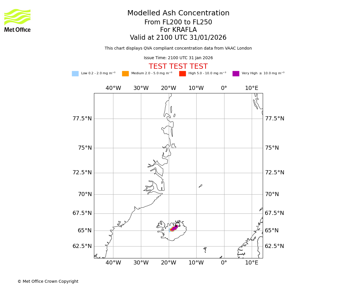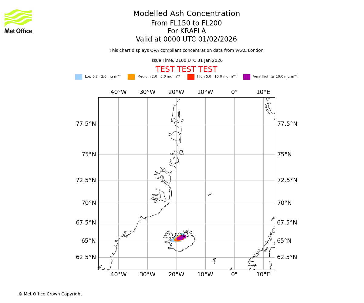 Modelled ash concentration from 150 to 200 for KRAFLA. Valid at 2100 UTC 31/01/2026