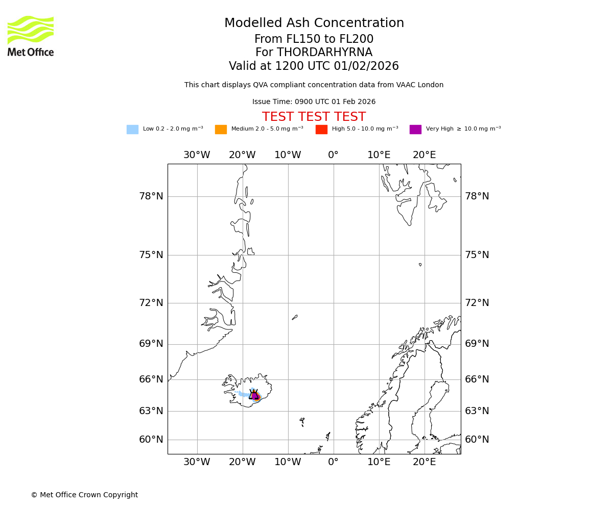 Modelled ash concentration from 150 to 200 for THORDARHYRNA. Valid at 0900 UTC 01/02/2026