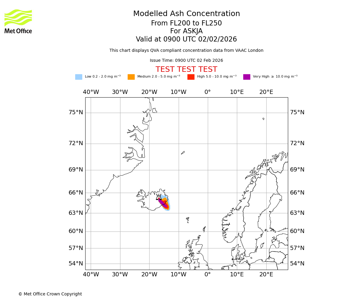 Modelled ash concentration from 150 to 200 for ASKJA. Valid at 0900 UTC 02/02/2026