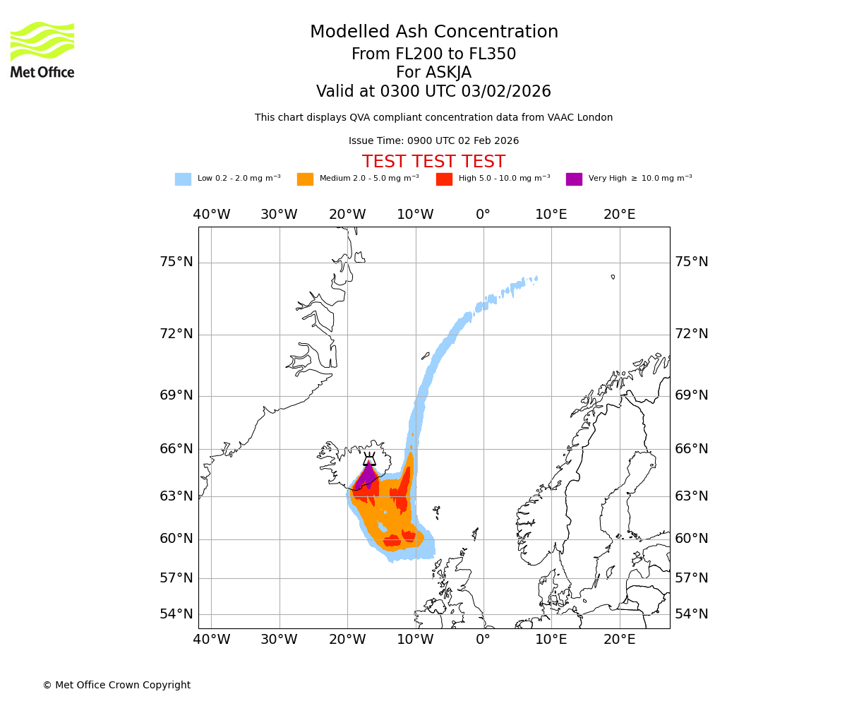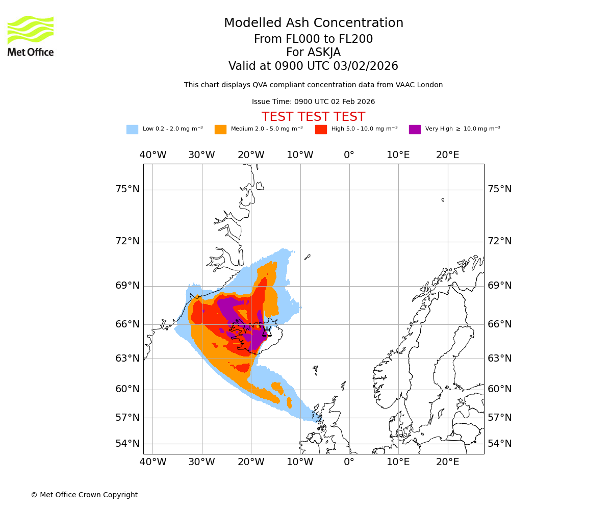 Modelled ash concentration from 000 to 200 for ASKJA. Valid at 0300 UTC 03/02/2026