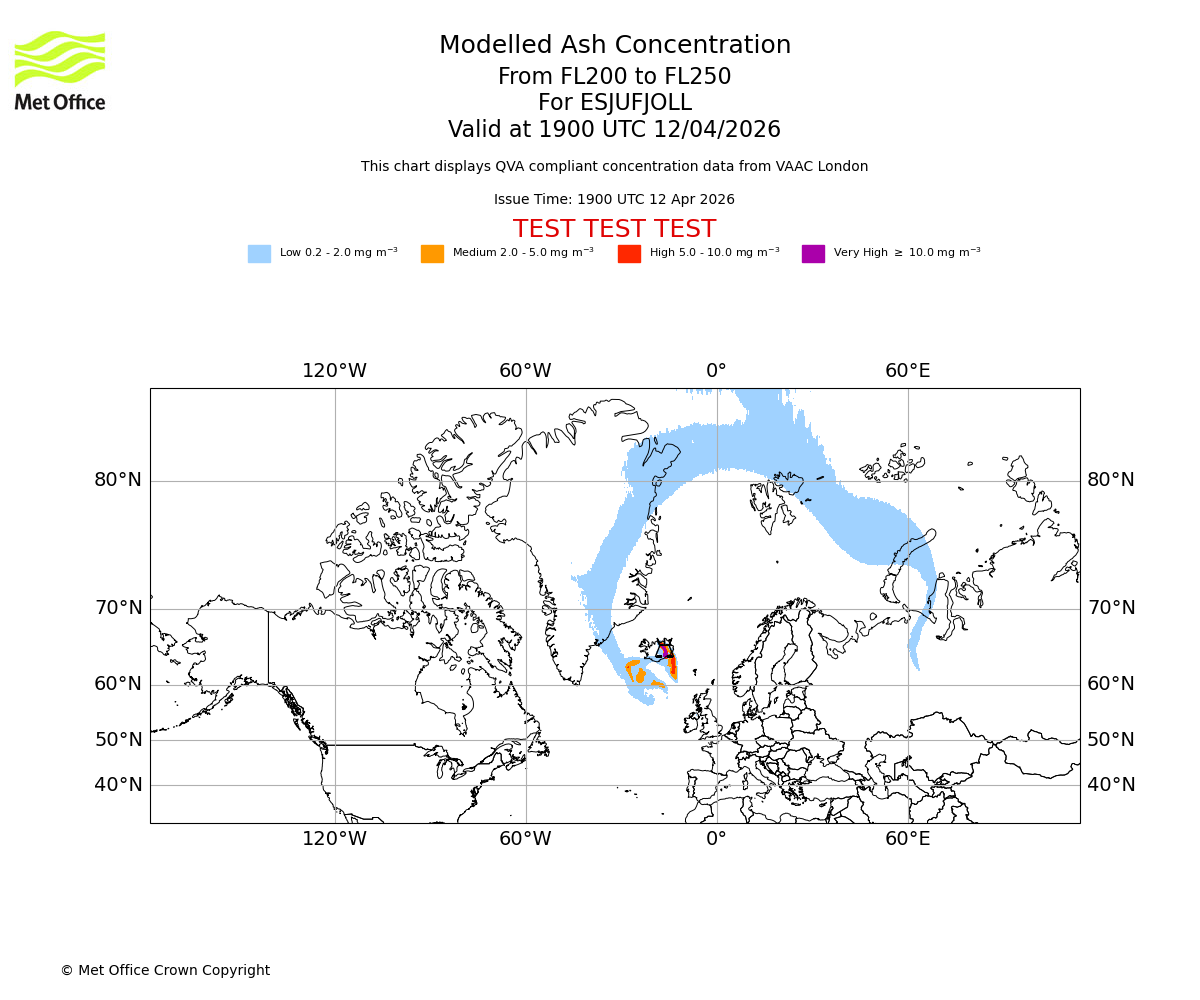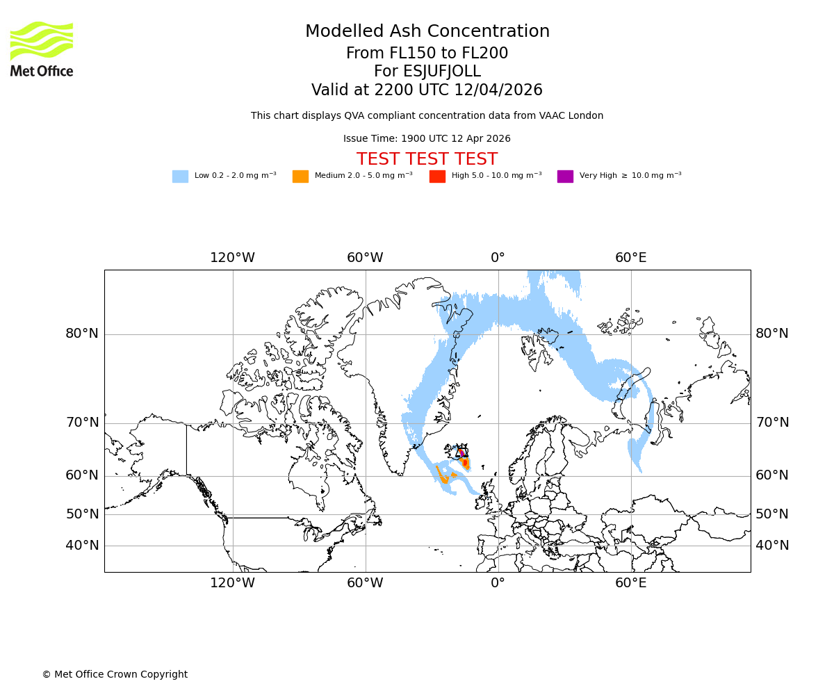Modelled ash concentration from 150 to 200 for ESJUFJOLL. Valid at 1900 UTC 12/04/2026