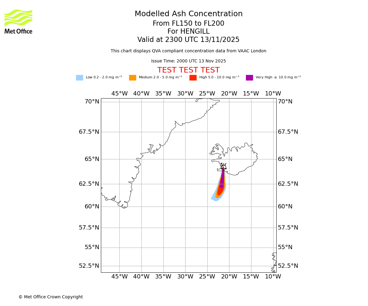 Modelled ash concentration from 150 to 200 for HENGILL. Valid at 2000 UTC 13/11/2025