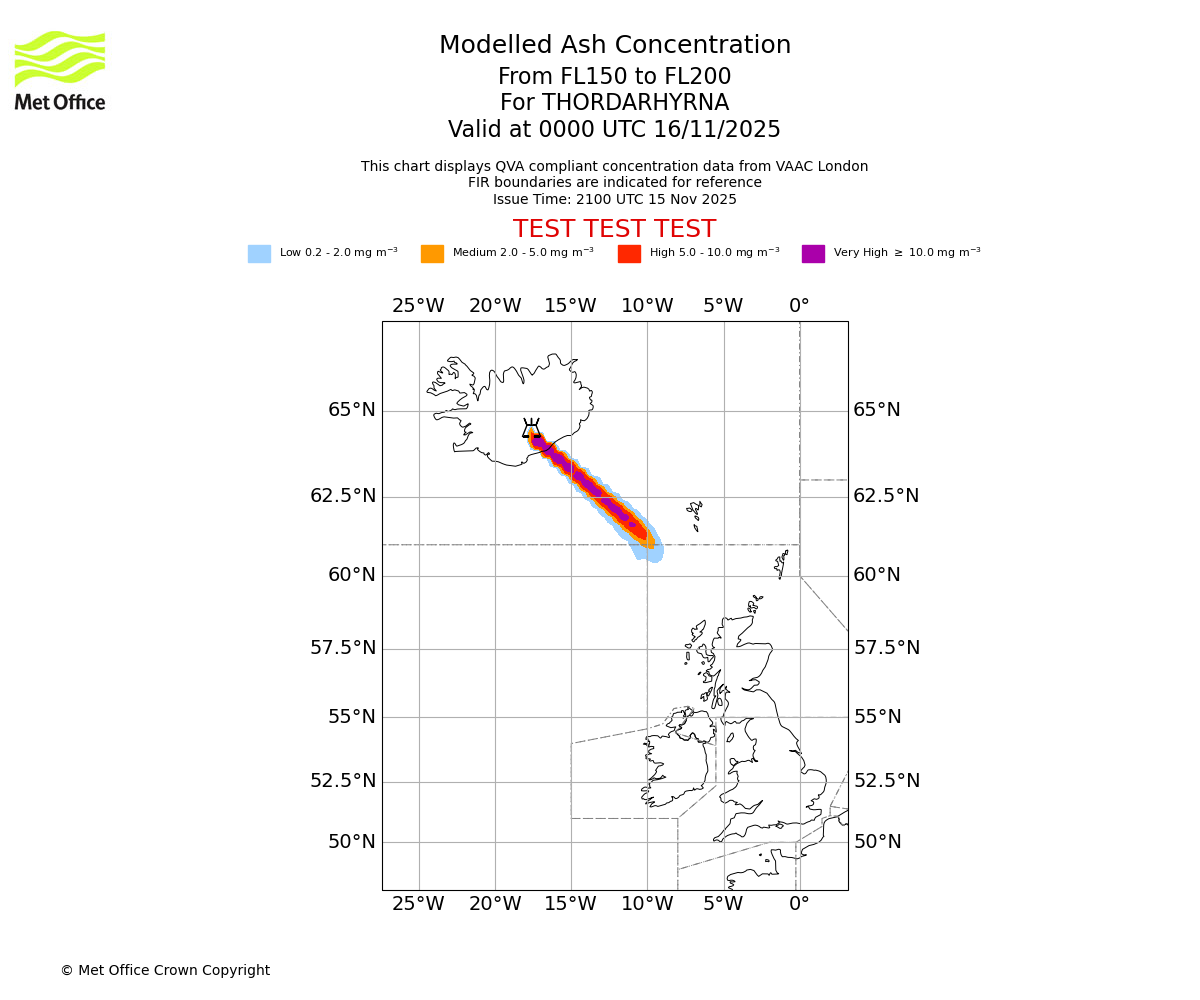 Modelled ash concentration from 150 to 200 for THORDARHYRNA. Valid at 2100 UTC 15/11/2025