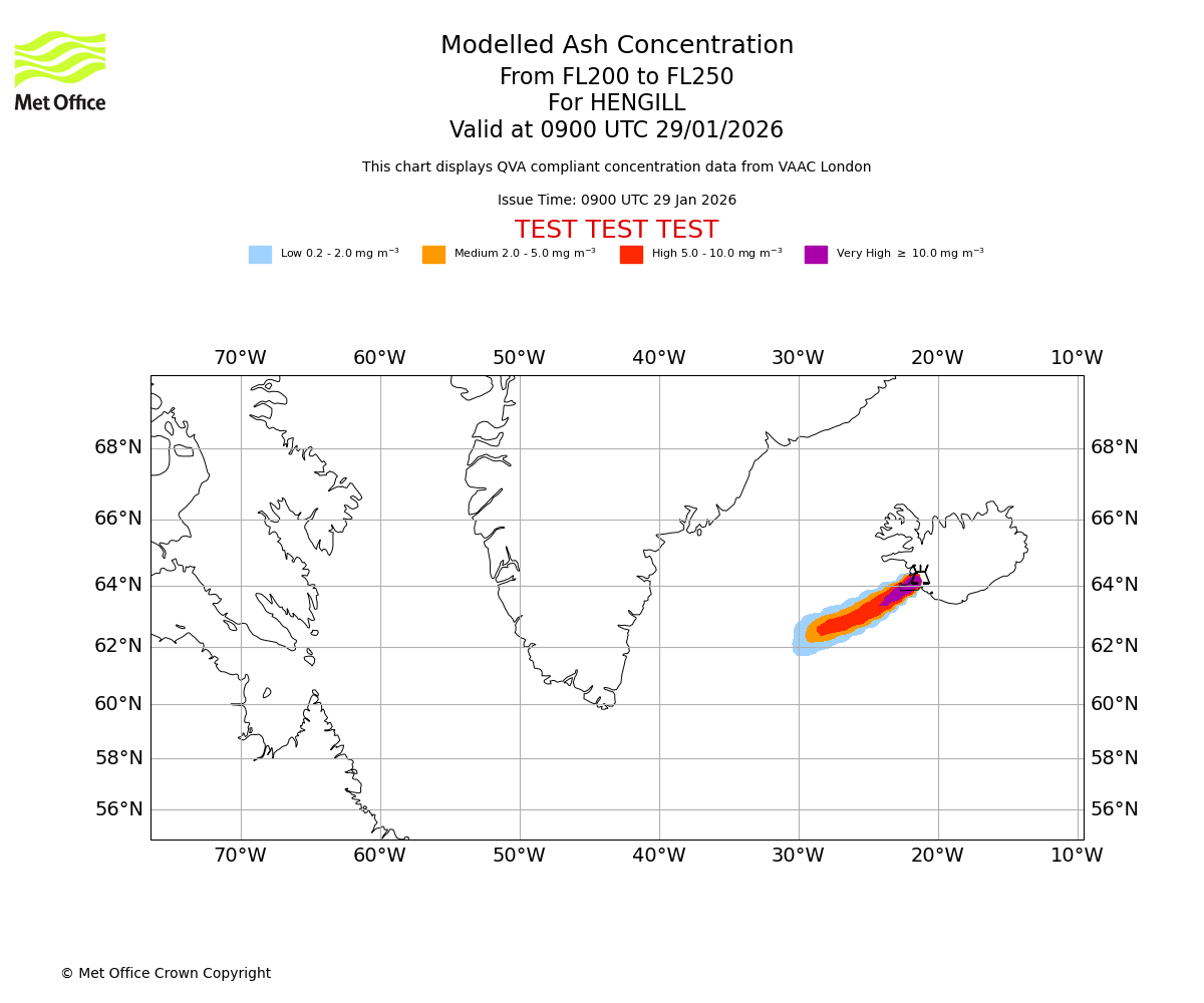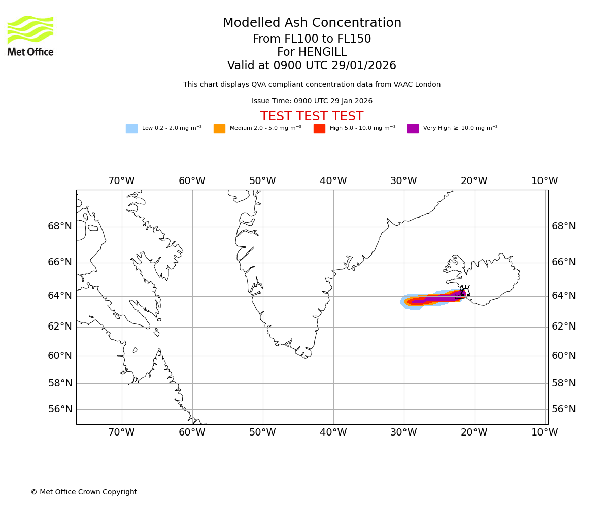 Modelled ash concentration from 000 to 200 for HENGILL. Valid at 0900 UTC 29/01/2026