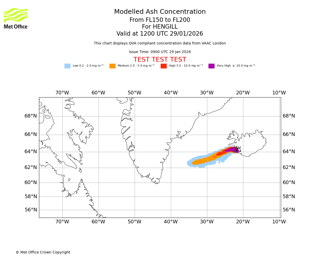 Modelled ash concentration from 150 to 200 for HENGILL. Valid at 0900 UTC 29/01/2026