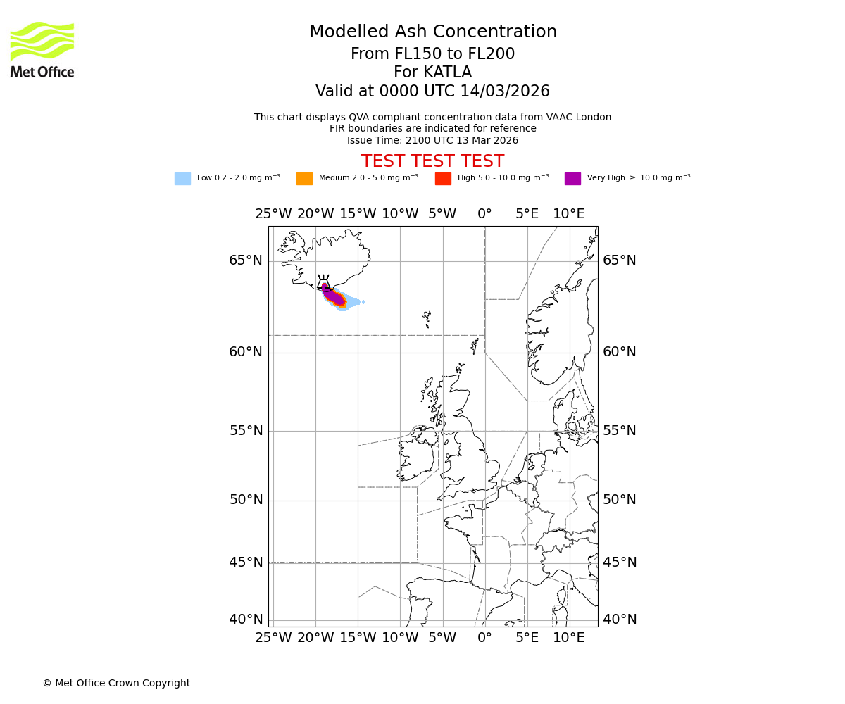 Modelled ash concentration from 150 to 200 for KATLA. Valid at 2100 UTC 13/03/2026