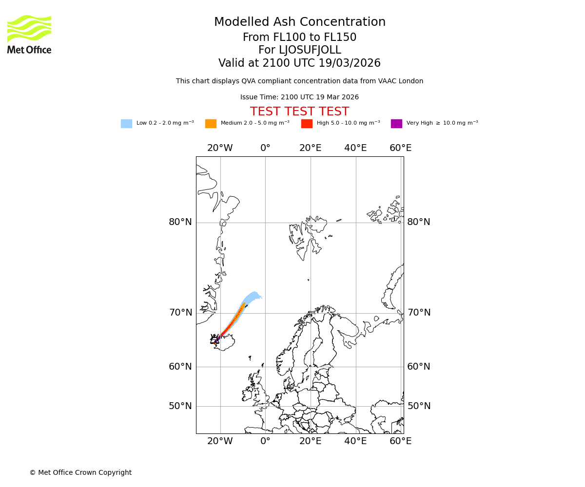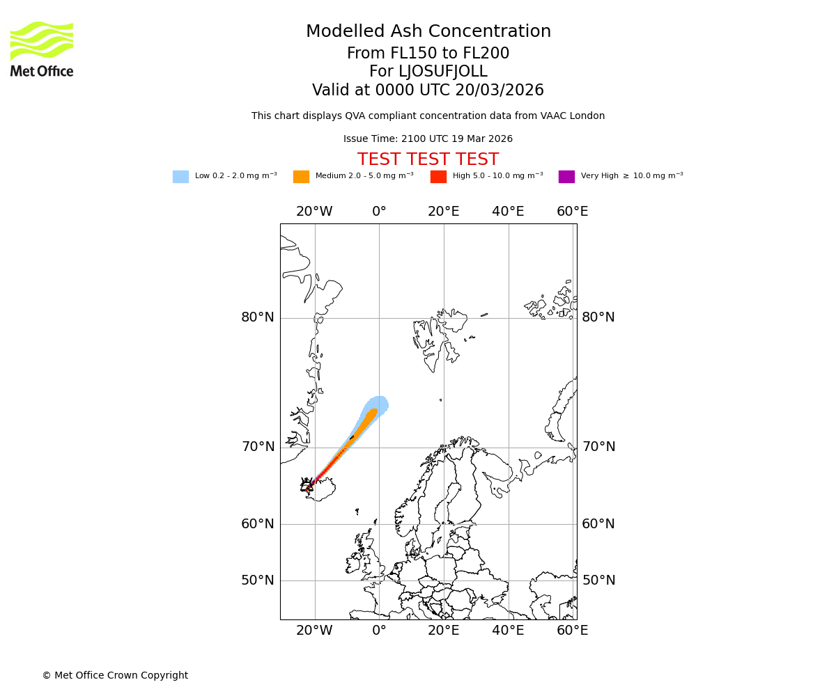 Modelled ash concentration from 150 to 200 for LJOSUFJOLL. Valid at 2100 UTC 19/03/2026