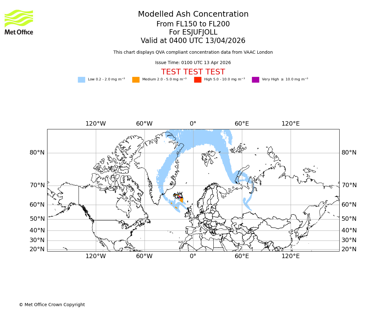 Modelled ash concentration from 150 to 200 for ESJUFJOLL. Valid at 0100 UTC 13/04/2026