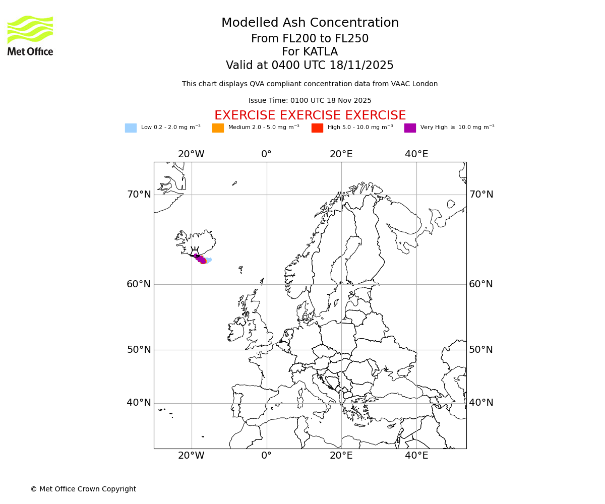 Modelled ash concentration from 200 to 250 for KATLA. Valid at 0100 UTC 18/11/2025