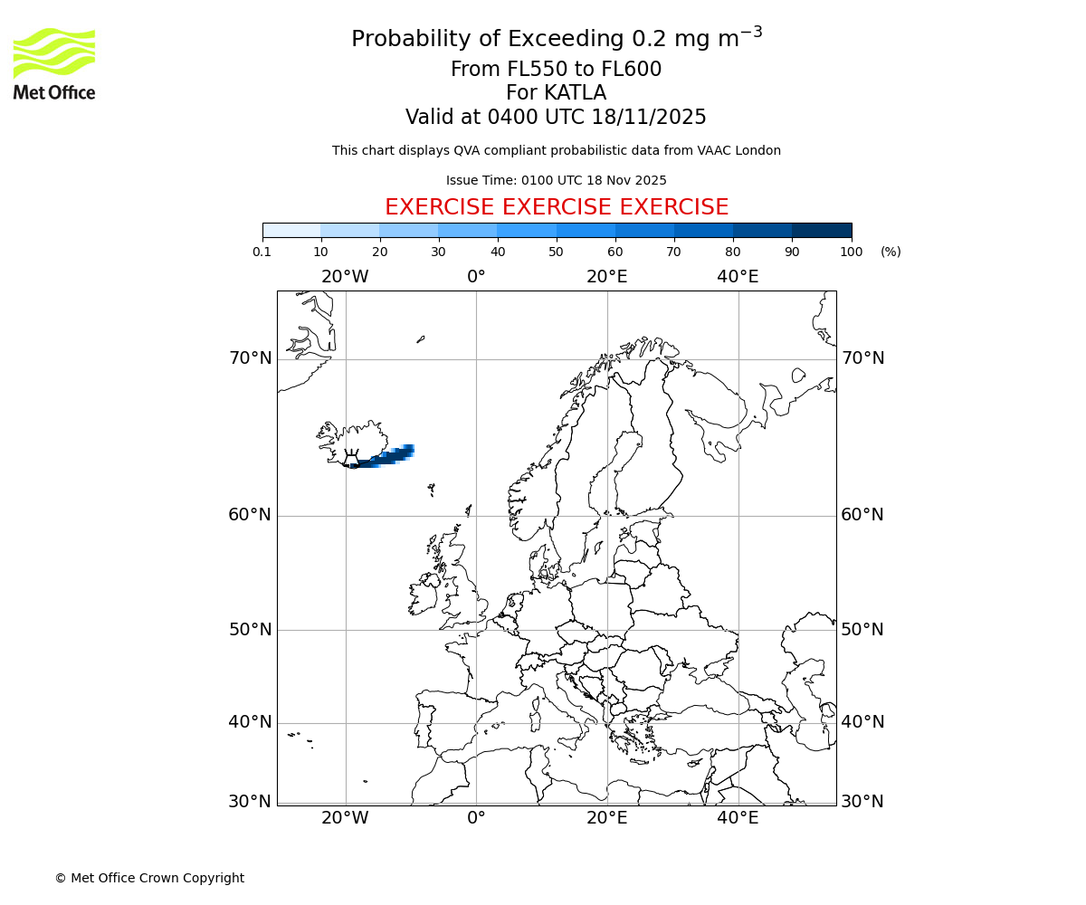 Probability of exceeding 0.2 milligrams per metre cubed. From 550 to 600 for KATLA. Valid at 0100 UTC 18/11/2025