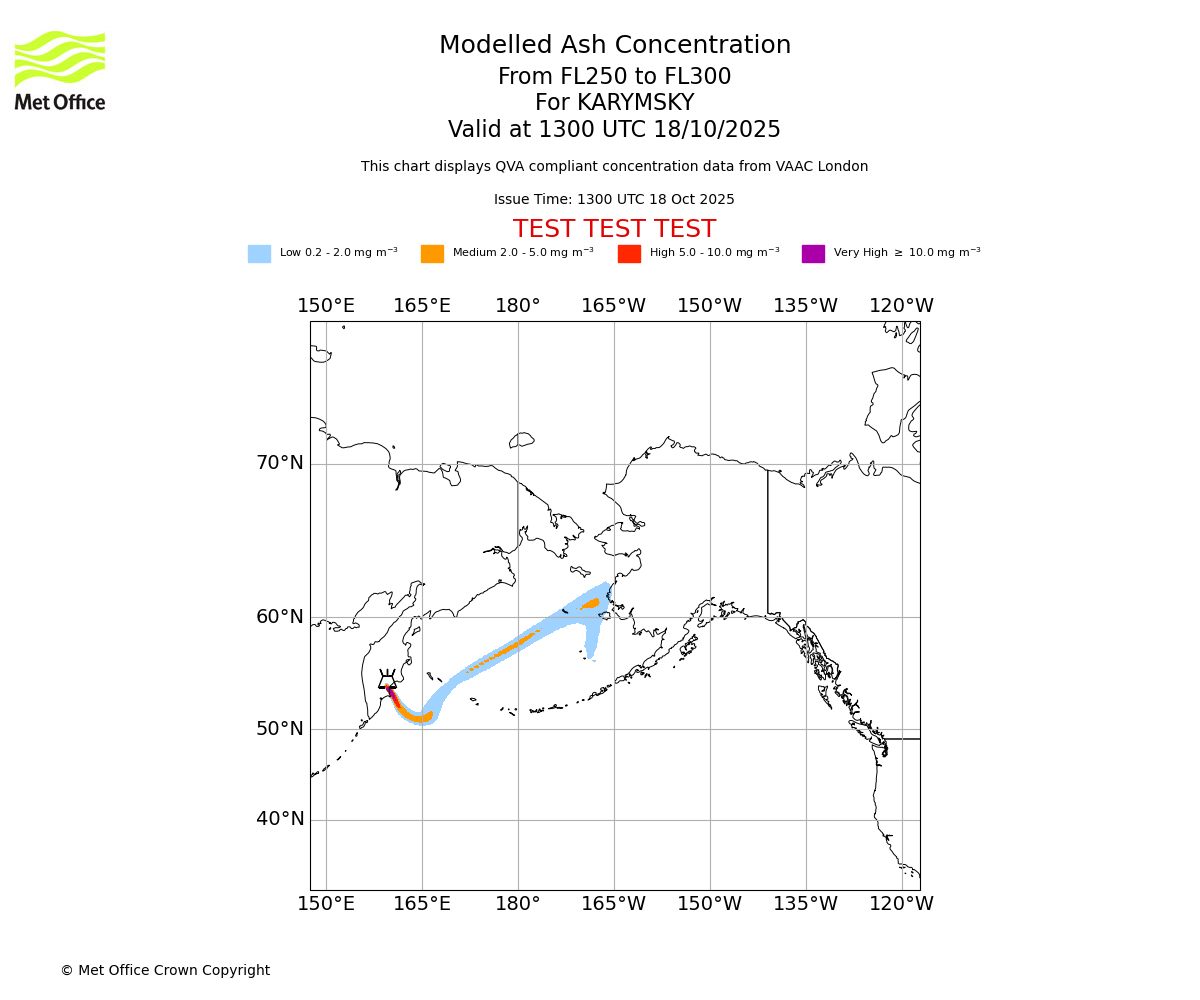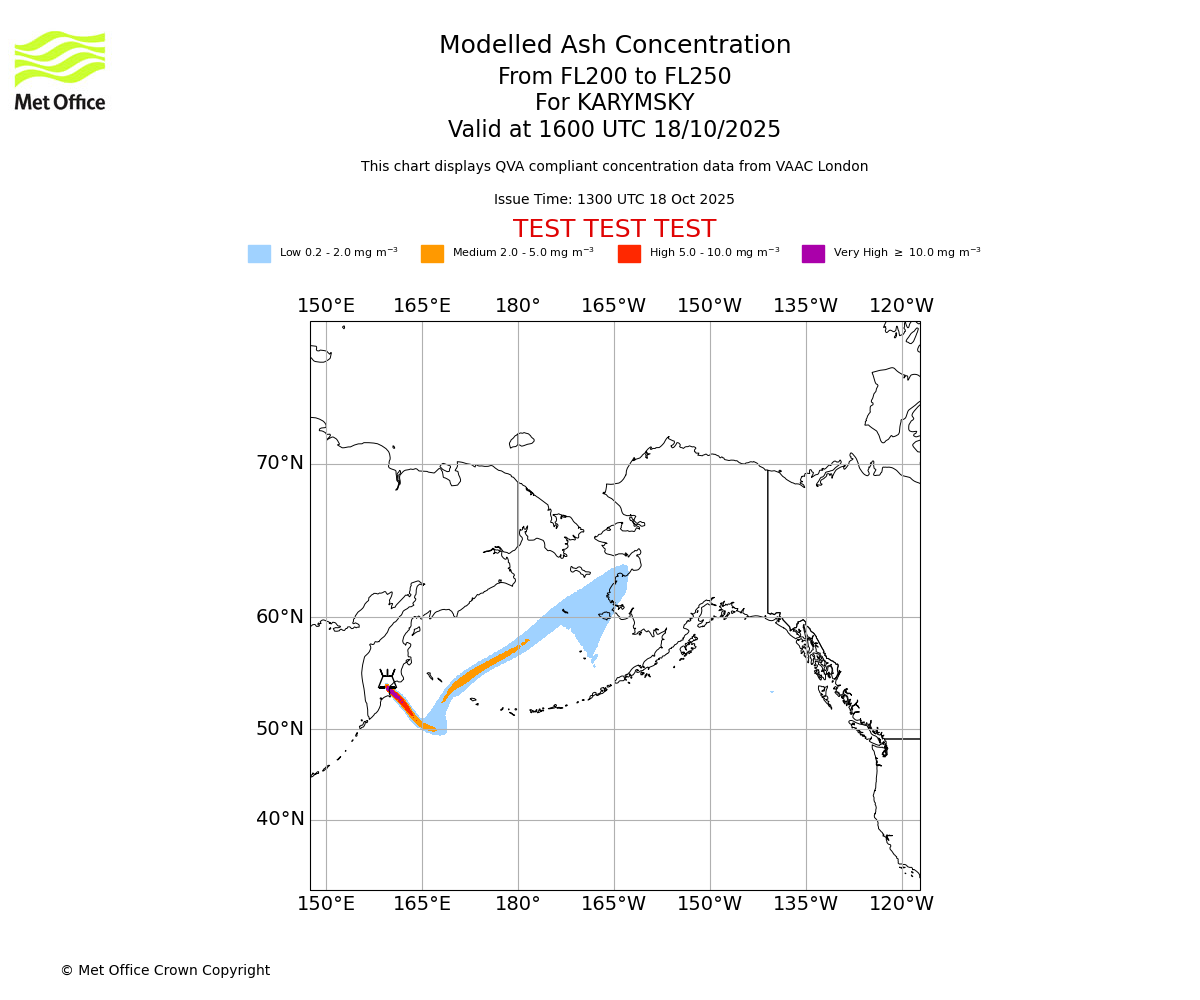 Modelled ash concentration from 200 to 250 for KARYMSKY. Valid at 1300 UTC 18/10/2025