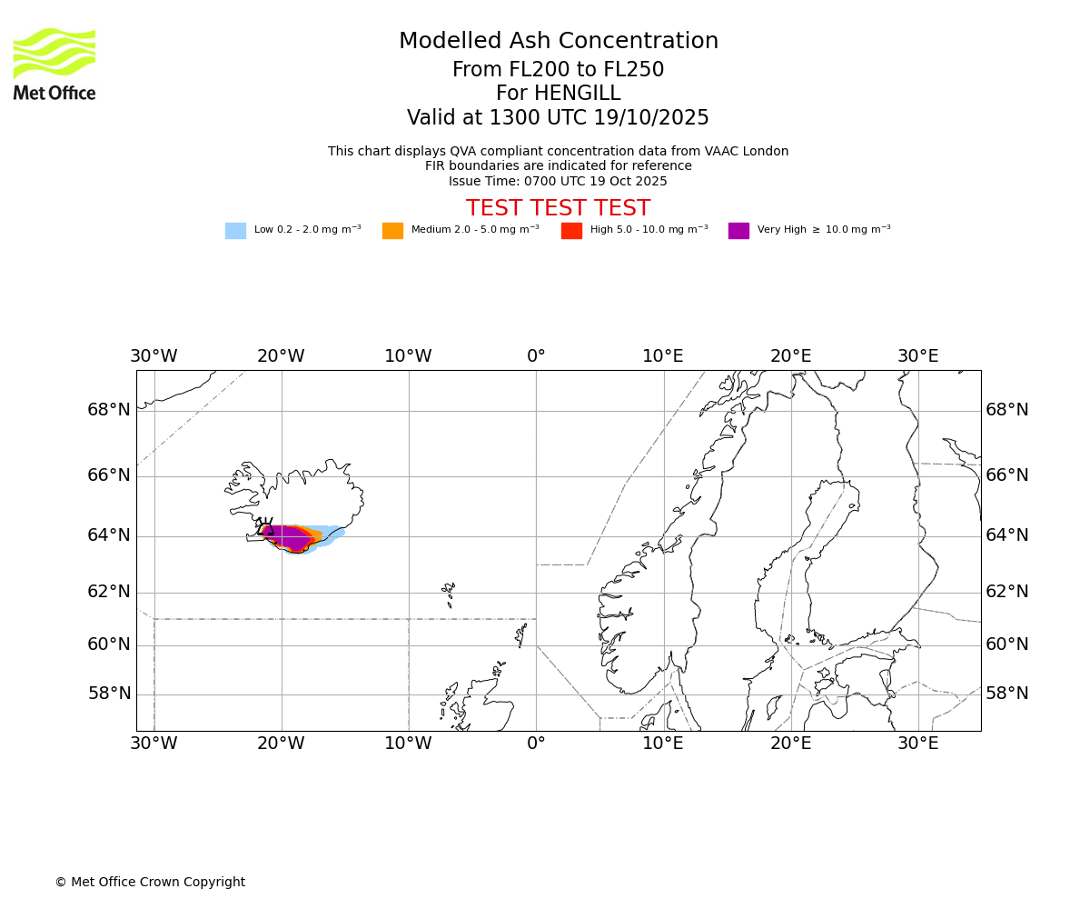Modelled ash concentration from 200 to 250 for HENGILL. Valid at 1000 UTC 19/10/2025