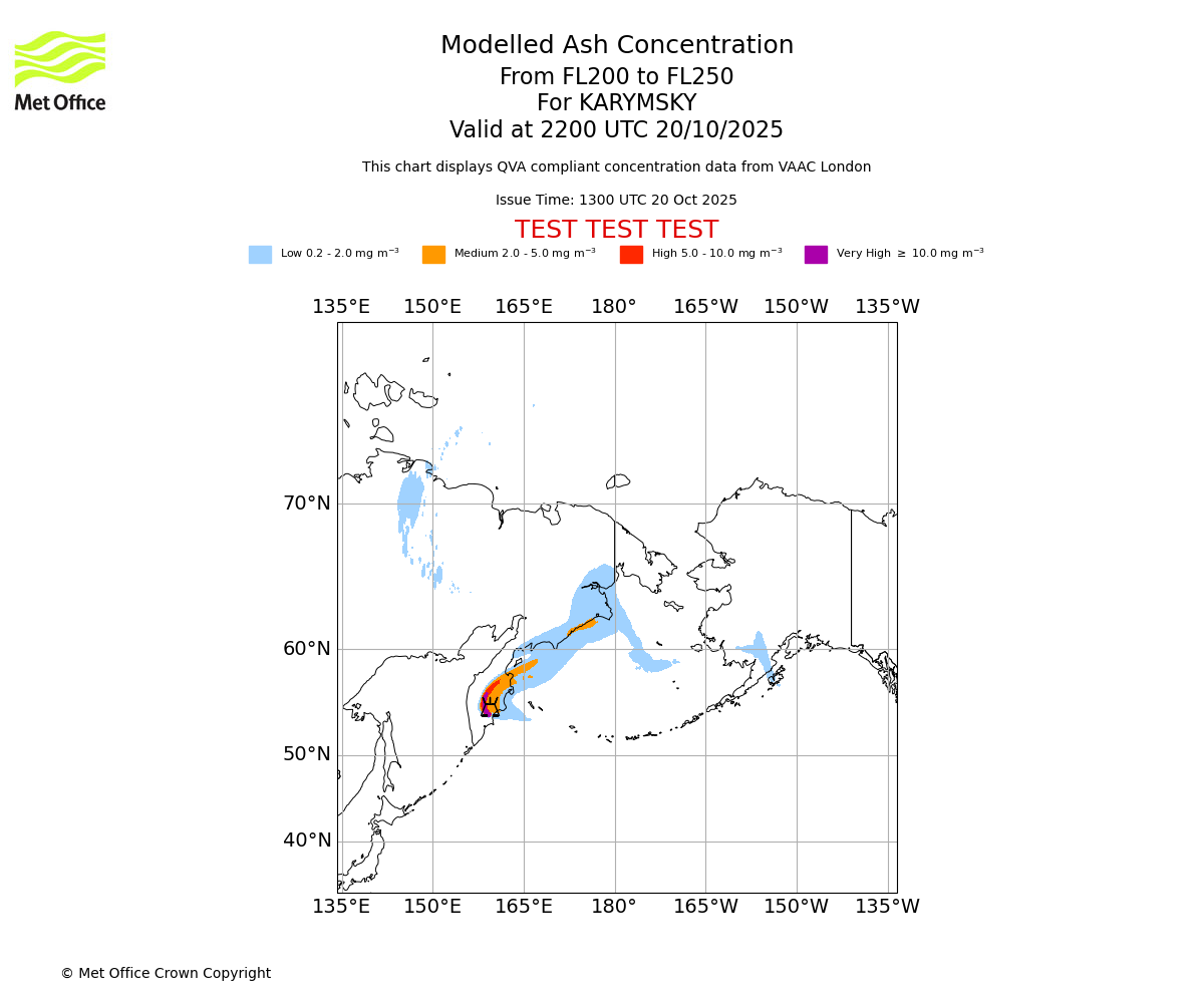 Modelled ash concentration from 000 to 200 for KARYMSKY. Valid at 1300 UTC 20/10/2025