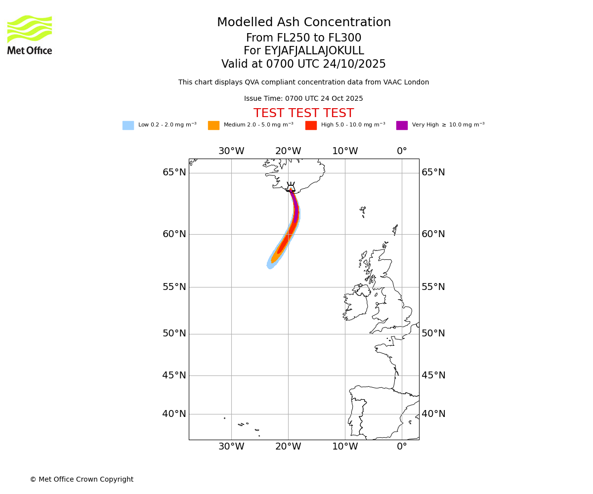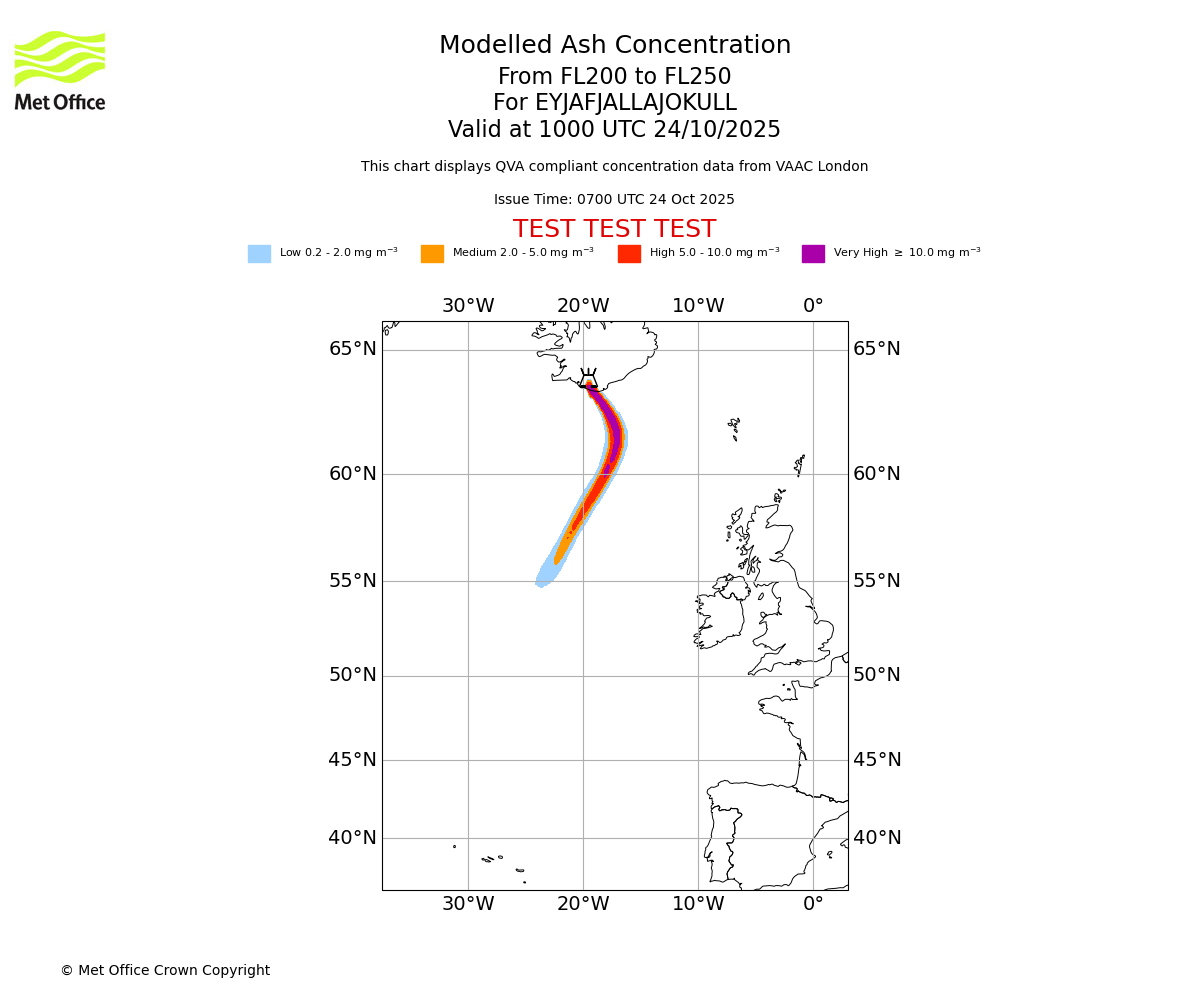 Modelled ash concentration from 200 to 250 for EYJAFJALLAJOKULL. Valid at 0700 UTC 24/10/2025