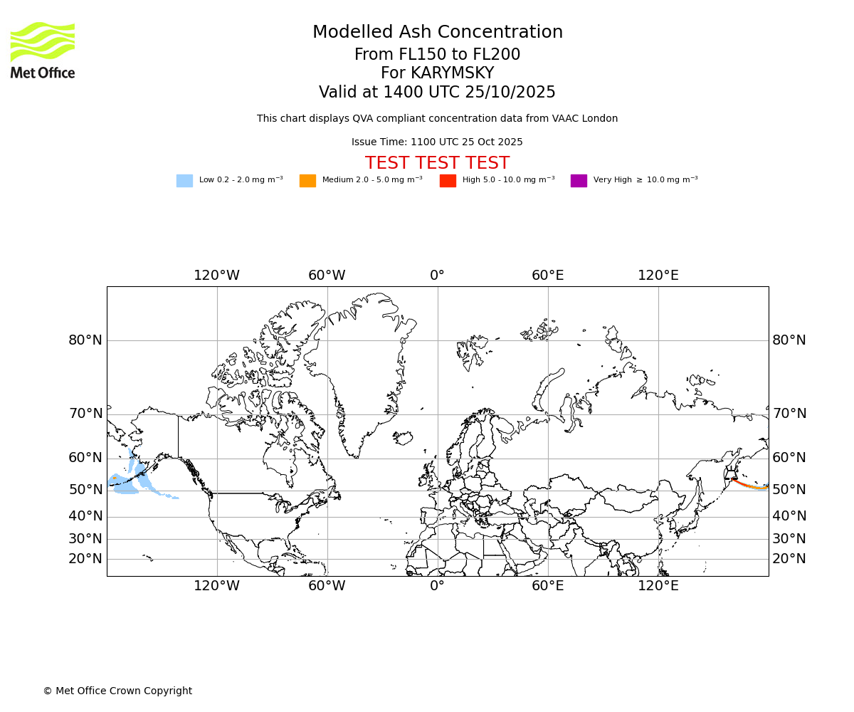 In accordance with ICAO Annex 3, Amendment 82 VAAC London will provide operational QVA forecasts from 27 November 2025 and these will be made available via a VAAC London QVA API information service. These charts are currently provided for test and evaluation purposes (not for operational use) until the introduction of the operational service.