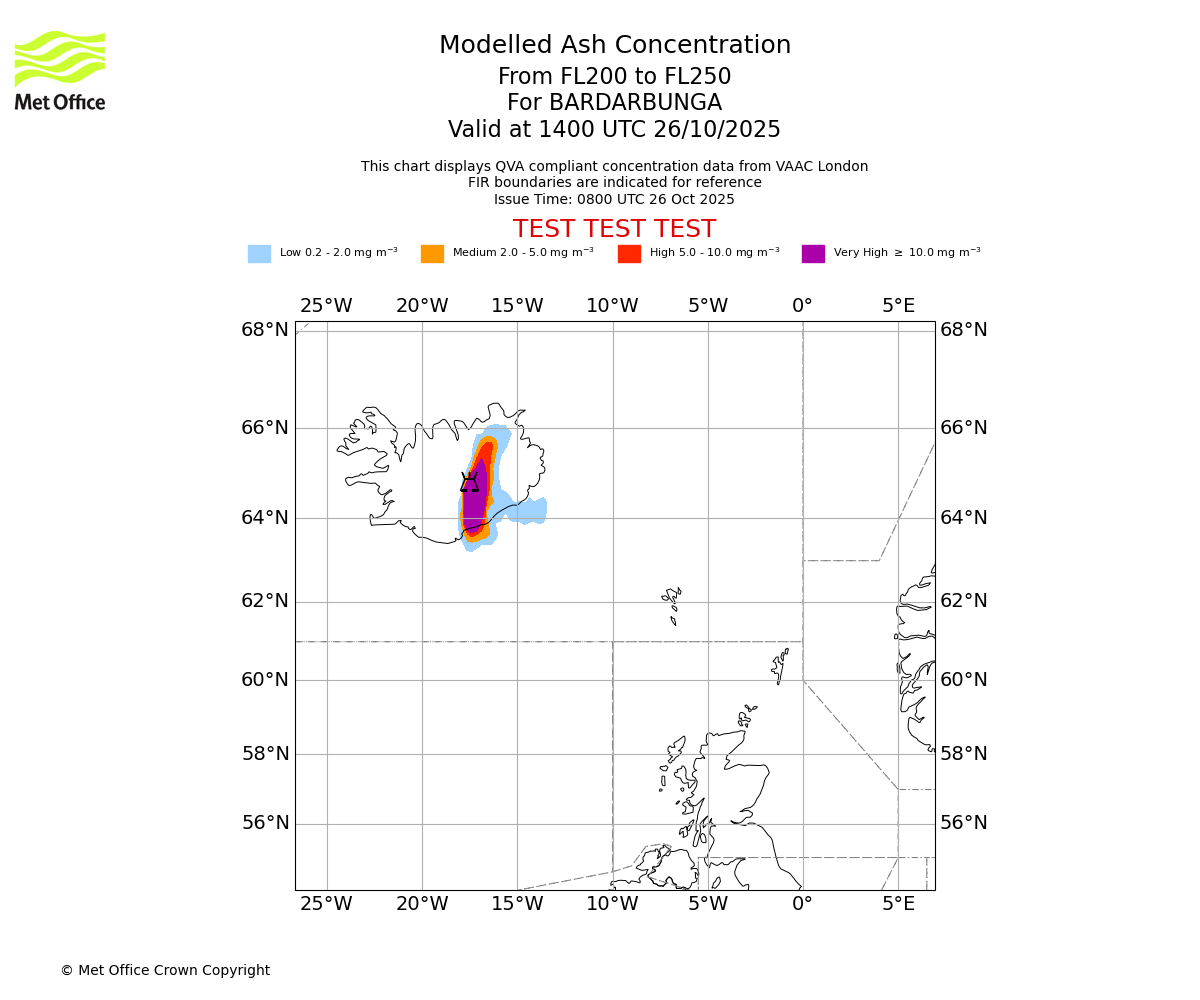 Modelled ash concentration from 200 to 250 for BARDARBUNGA. Valid at 1100 UTC 26/10/2025