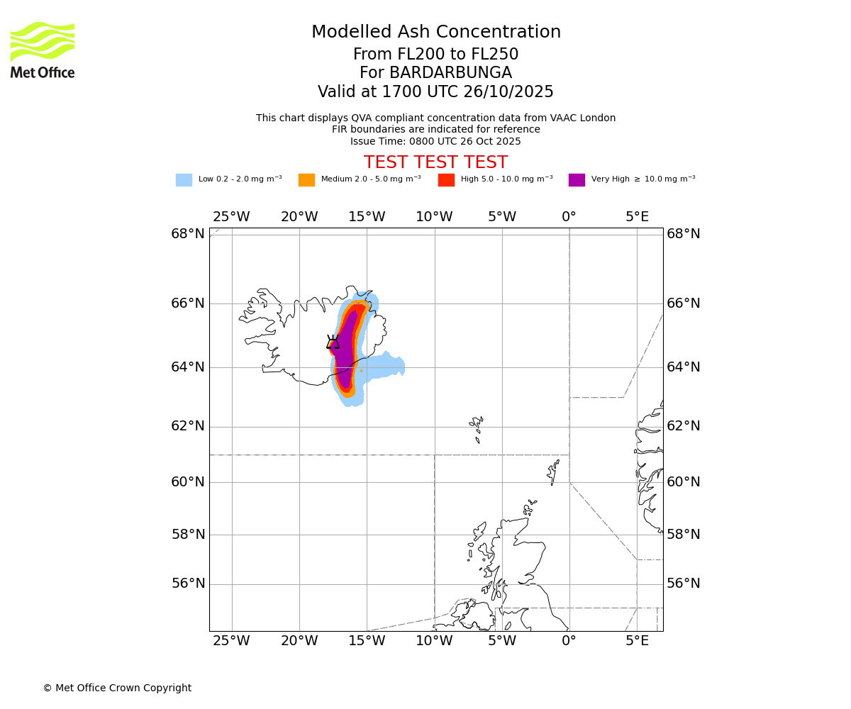 Modelled ash concentration from 200 to 250 for BARDARBUNGA. Valid at 1400 UTC 26/10/2025
