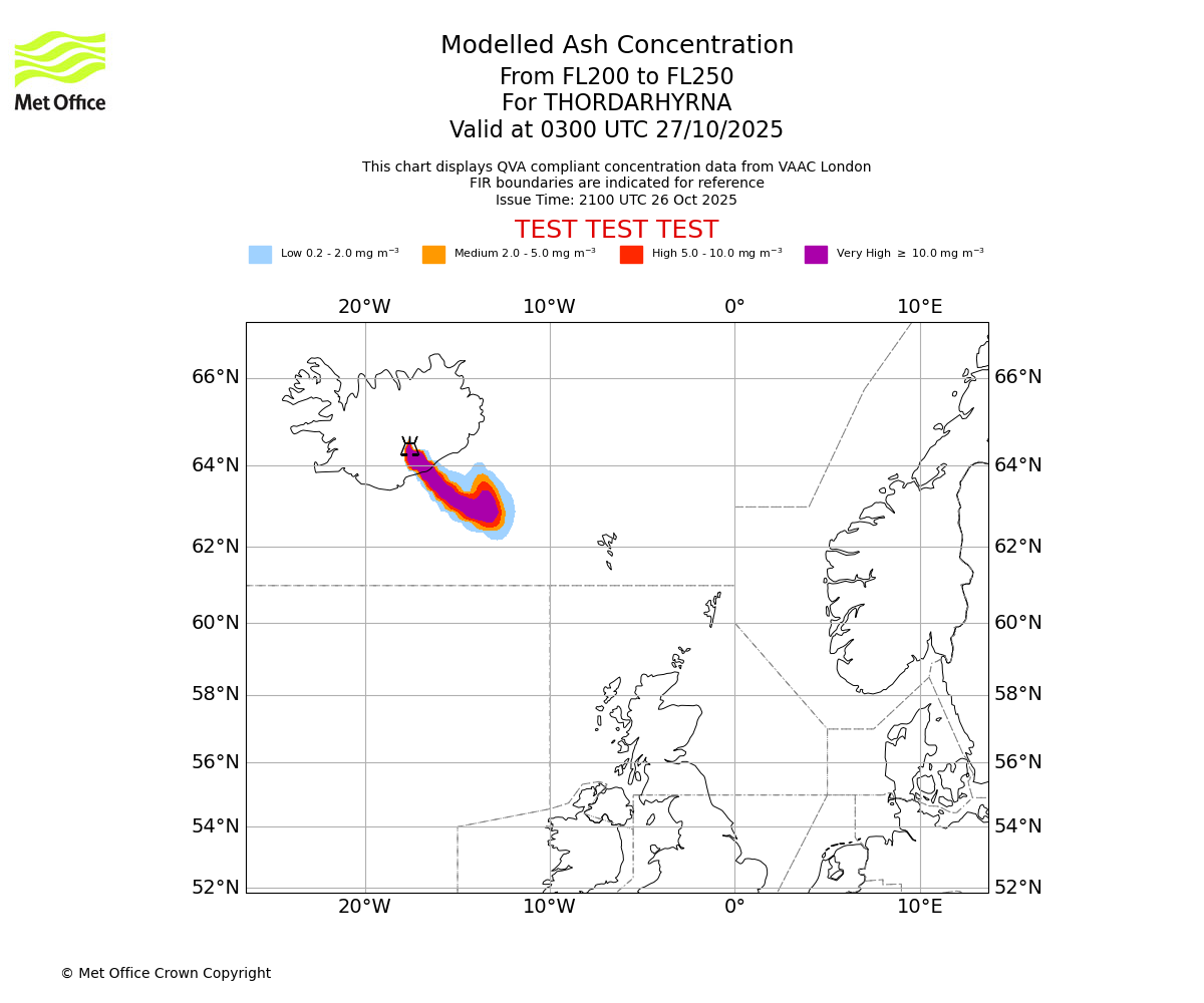Modelled ash concentration from 200 to 250 for THORDARHYRNA. Valid at 0000 UTC 27/10/2025