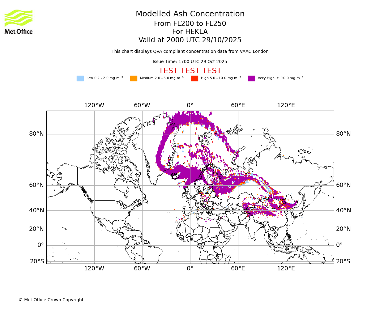 In accordance with ICAO Annex 3, Amendment 82 VAAC London will provide operational QVA forecasts from 27 November 2025 and these will be made available via a VAAC London QVA API information service. These charts are currently provided for test and evaluation purposes (not for operational use) until the introduction of the operational service.