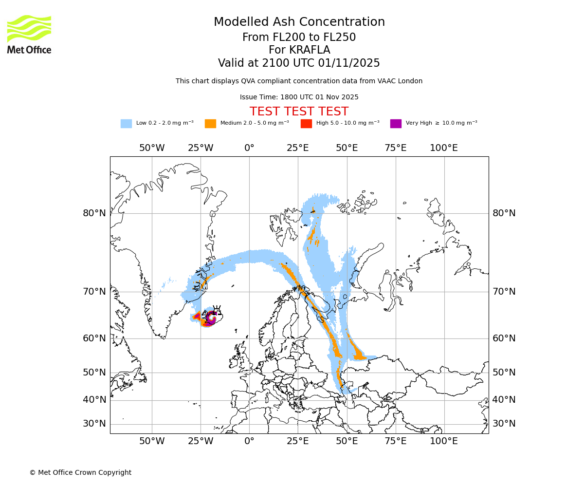 In accordance with ICAO Annex 3, Amendment 82 VAAC London will provide operational QVA forecasts from 27 November 2025 and these will be made available via a VAAC London QVA API information service. These charts are currently provided for test and evaluation purposes (not for operational use) until the introduction of the operational service.