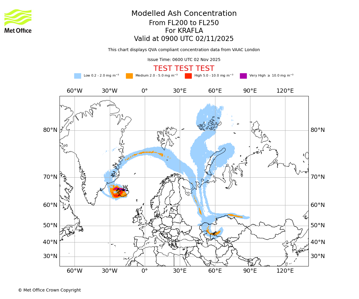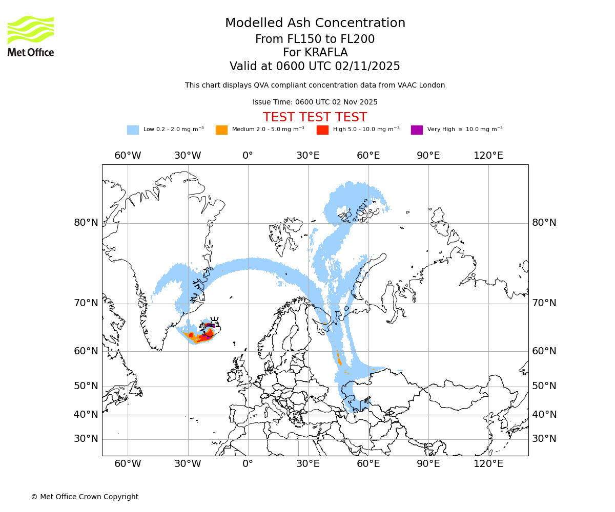 In accordance with ICAO Annex 3, Amendment 82 VAAC London will provide operational QVA forecasts from 27 November 2025 and these will be made available via a VAAC London QVA API information service. These charts are currently provided for test and evaluation purposes (not for operational use) until the introduction of the operational service.