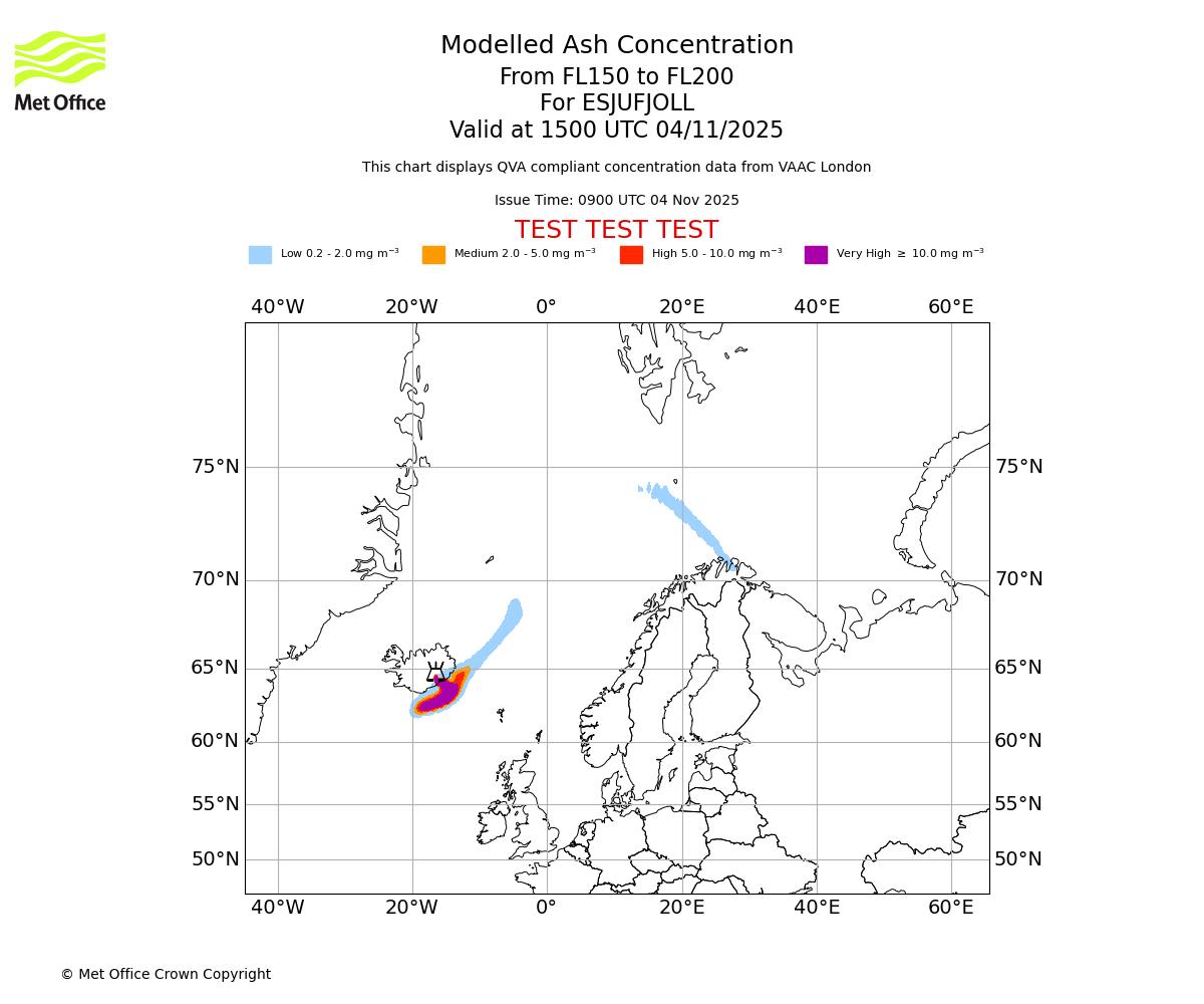 Modelled ash concentration from 200 to 250 for ESJUFJOLL. Valid at 1500 UTC 04/11/2025