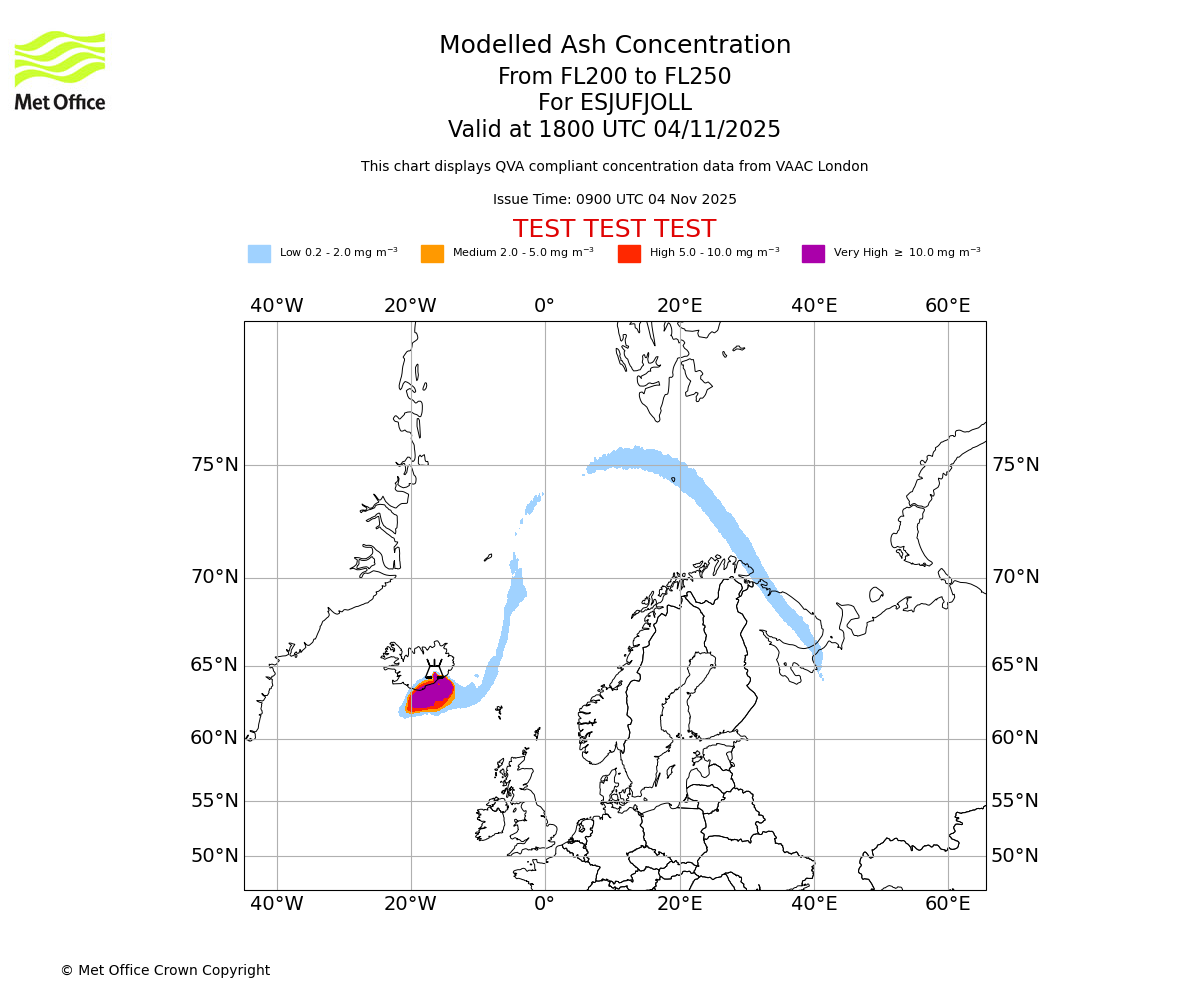 In accordance with ICAO Annex 3, Amendment 82 VAAC London will provide operational QVA forecasts from 27 November 2025 and these will be made available via a VAAC London QVA API information service. These charts are currently provided for test and evaluation purposes (not for operational use) until the introduction of the operational service.