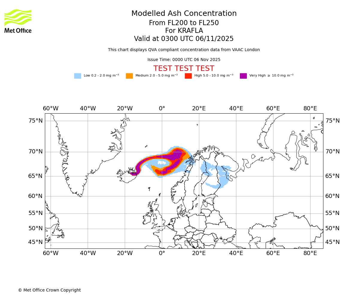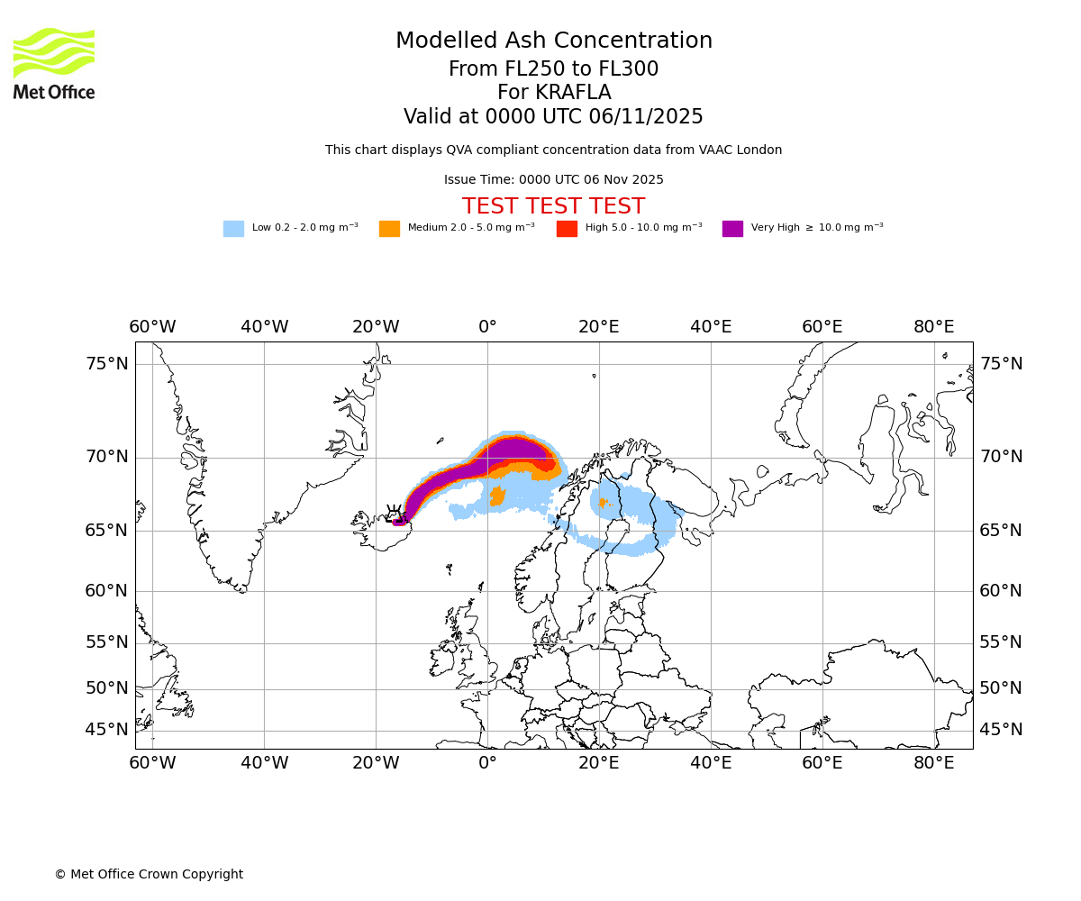 In accordance with ICAO Annex 3, Amendment 82 VAAC London will provide operational QVA forecasts from 27 November 2025 and these will be made available via a VAAC London QVA API information service. These charts are currently provided for test and evaluation purposes (not for operational use) until the introduction of the operational service.