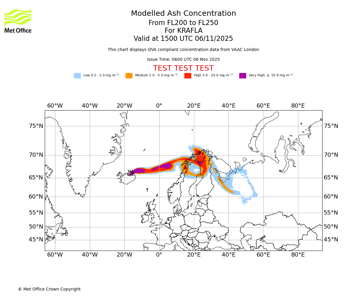 In accordance with ICAO Annex 3, Amendment 82 VAAC London will provide operational QVA forecasts from 27 November 2025 and these will be made available via a VAAC London QVA API information service. These charts are currently provided for test and evaluation purposes (not for operational use) until the introduction of the operational service.