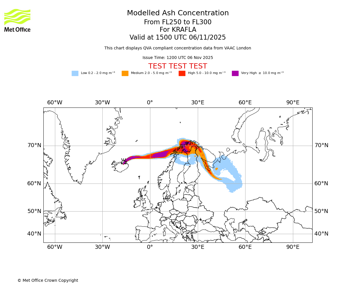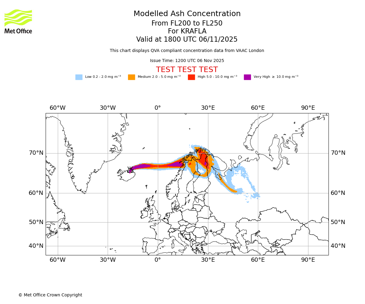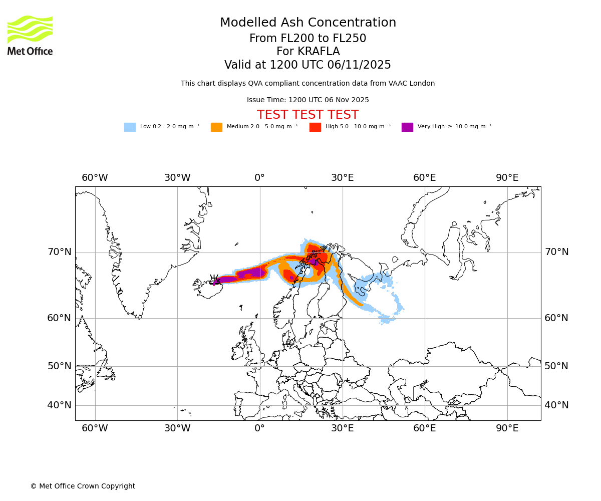 In accordance with ICAO Annex 3, Amendment 82 VAAC London will provide operational QVA forecasts from 27 November 2025 and these will be made available via a VAAC London QVA API information service. These charts are currently provided for test and evaluation purposes (not for operational use) until the introduction of the operational service.