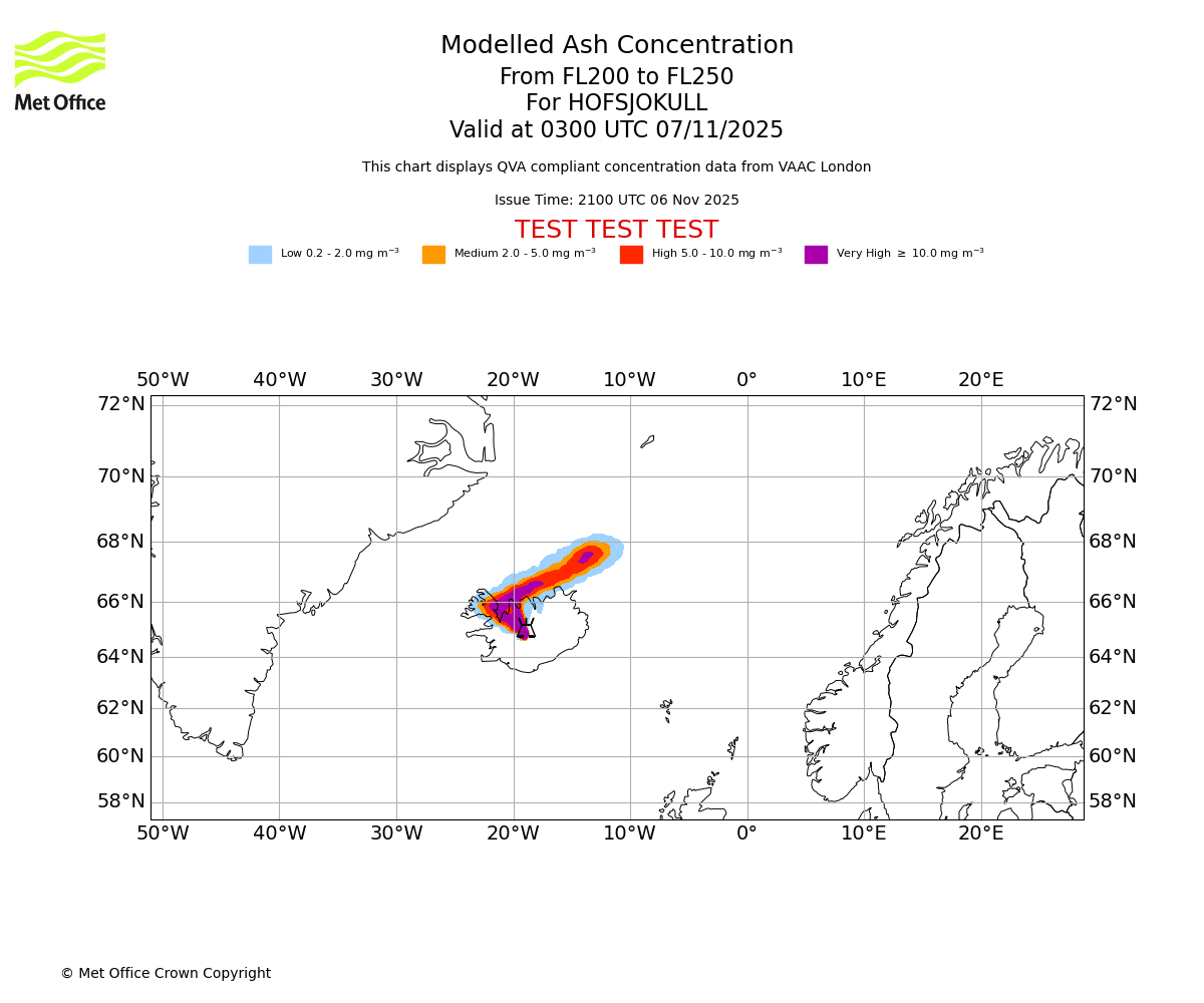 In accordance with ICAO Annex 3, Amendment 82 VAAC London will provide operational QVA forecasts from 27 November 2025 and these will be made available via a VAAC London QVA API information service. These charts are currently provided for test and evaluation purposes (not for operational use) until the introduction of the operational service.