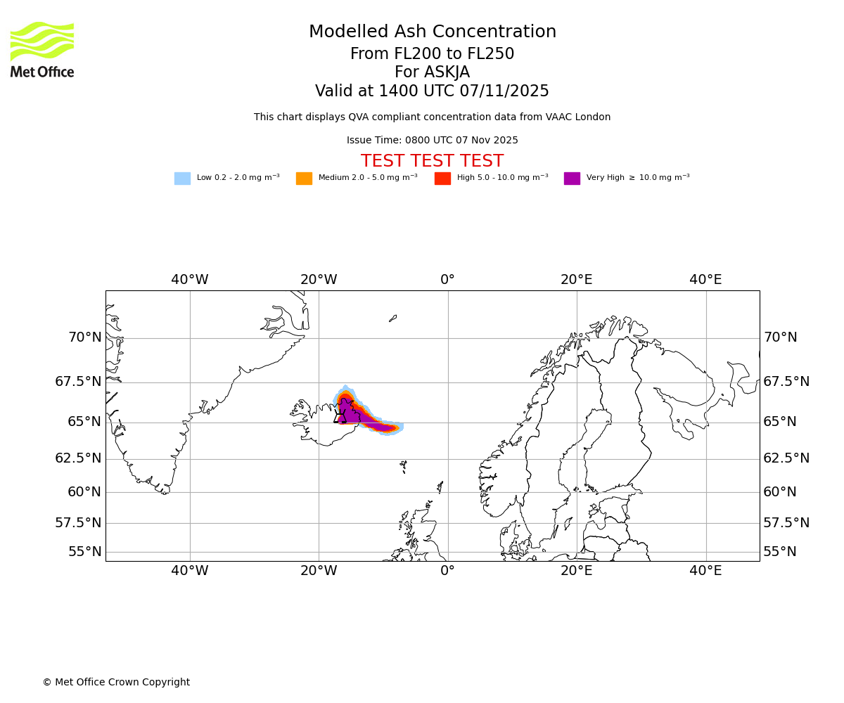 In accordance with ICAO Annex 3, Amendment 82 VAAC London will provide operational QVA forecasts from 27 November 2025 and these will be made available via a VAAC London QVA API information service. These charts are currently provided for test and evaluation purposes (not for operational use) until the introduction of the operational service.