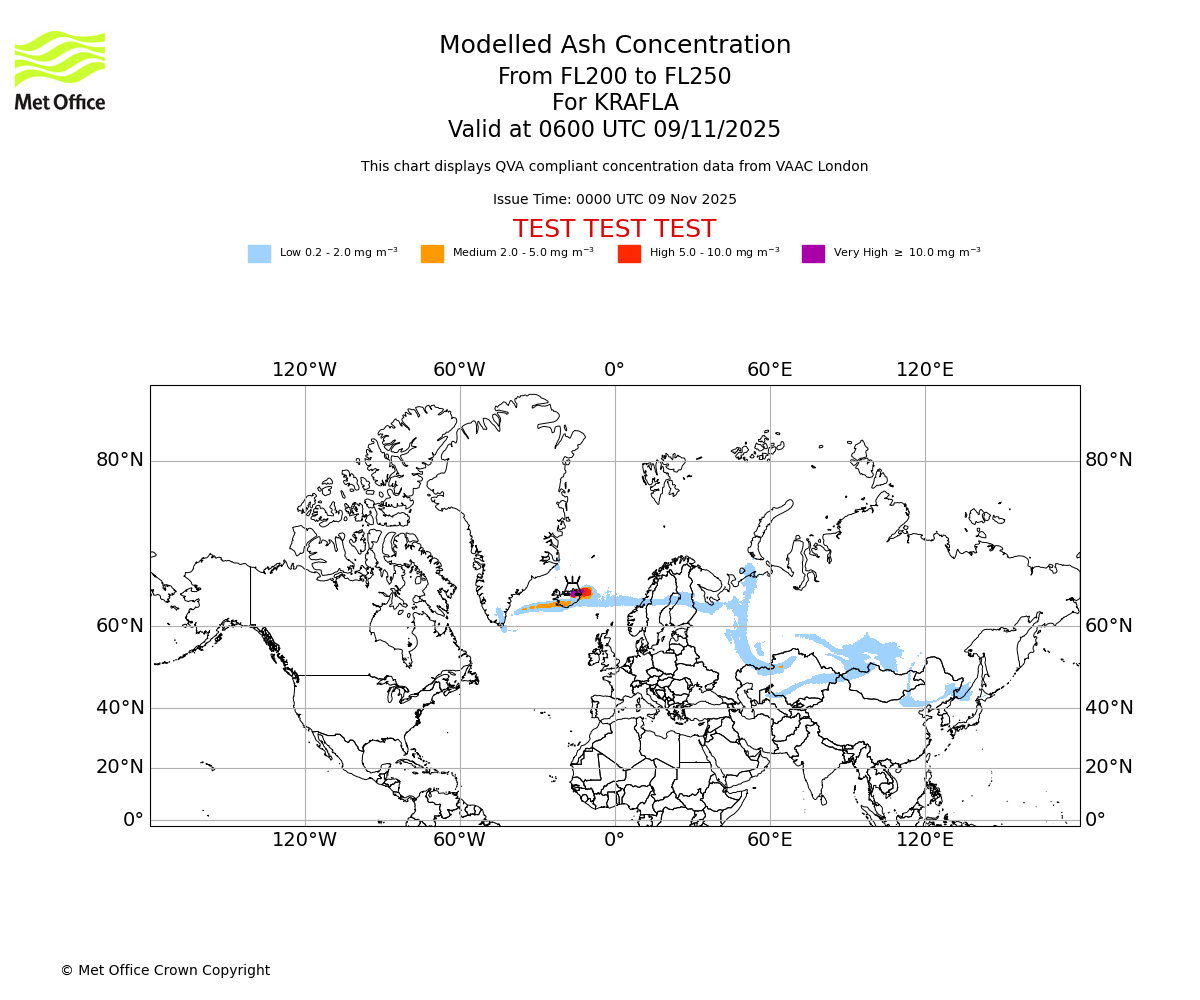 In accordance with ICAO Annex 3, Amendment 82 VAAC London will provide operational QVA forecasts from 27 November 2025 and these will be made available via a VAAC London QVA API information service. These charts are currently provided for test and evaluation purposes (not for operational use) until the introduction of the operational service.