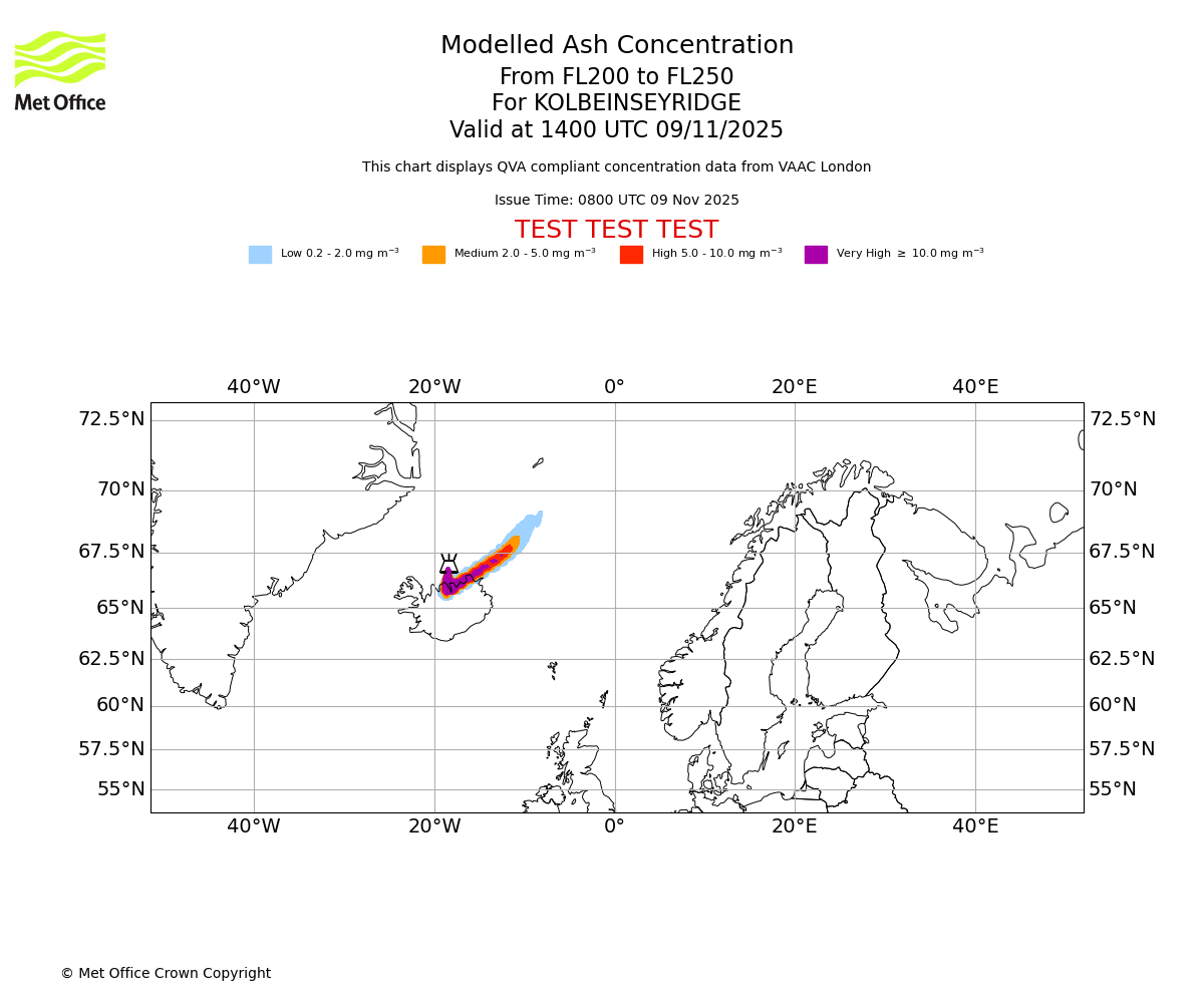 Modelled ash concentration from 200 to 250 for KOLBEINSEYRIDGE. Valid at 1100 UTC 09/11/2025