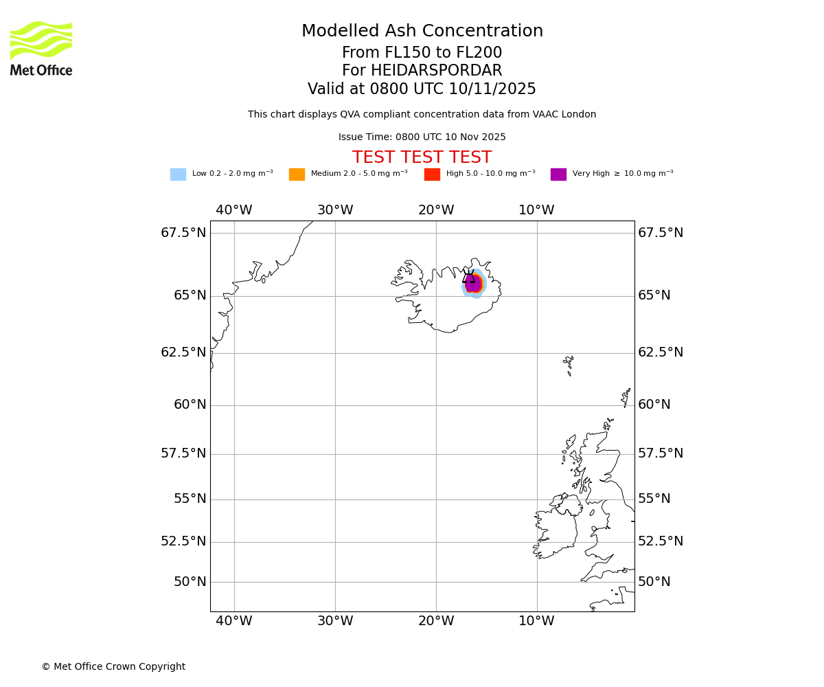 Modelled ash concentration from 200 to 250 for HEIDARSPORDAR. Valid at 0800 UTC 10/11/2025