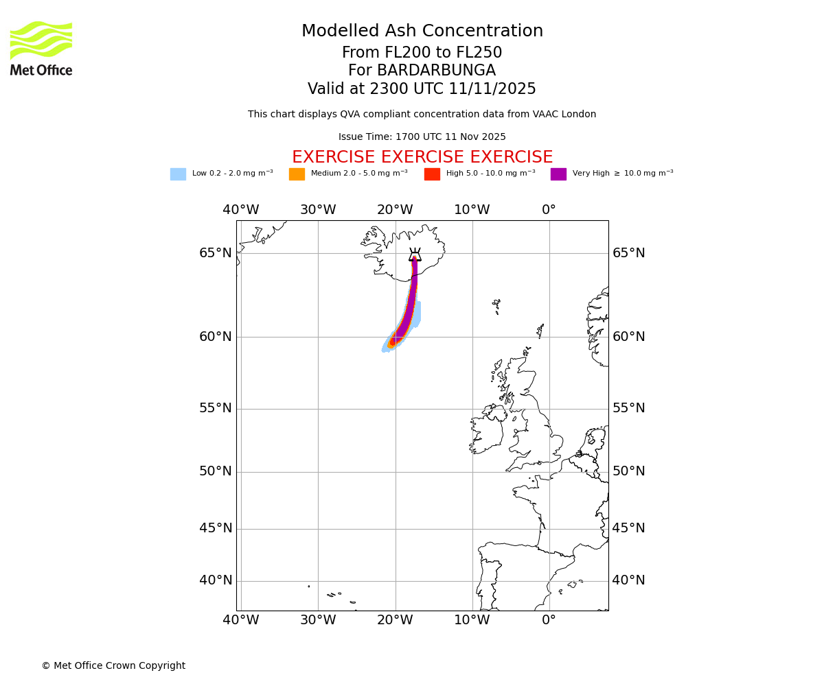 Modelled ash concentration from 200 to 250 for BARDARBUNGA. Valid at 2000 UTC 11/11/2025