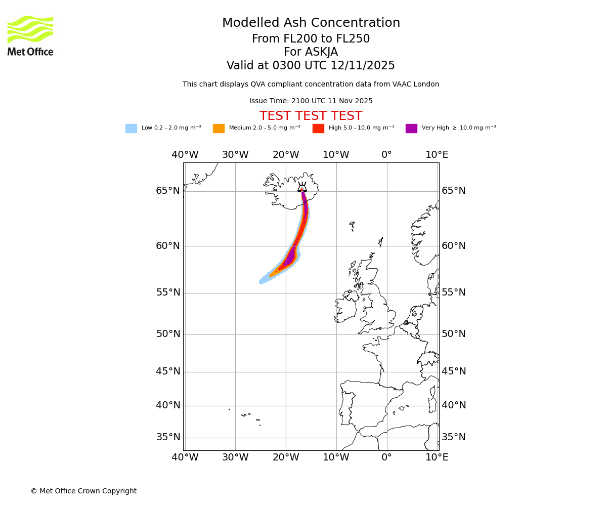 In accordance with ICAO Annex 3, Amendment 82 VAAC London will provide operational QVA forecasts from 27 November 2025 and these will be made available via a VAAC London QVA API information service. These charts are currently provided for test and evaluation purposes (not for operational use) until the introduction of the operational service.