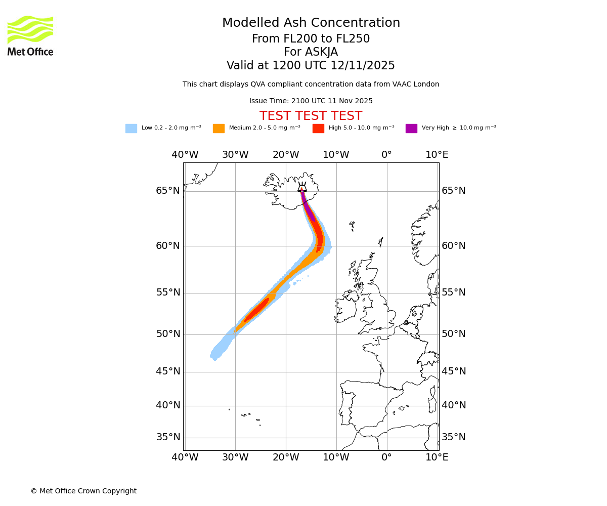 Modelled ash concentration from 200 to 250 for ASKJA. Valid at 0900 UTC 12/11/2025