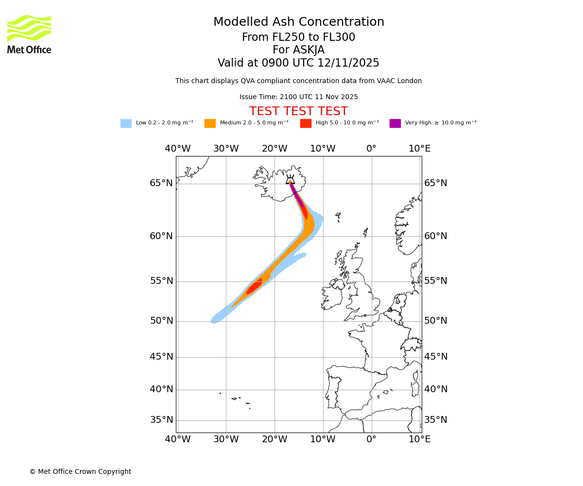 In accordance with ICAO Annex 3, Amendment 82 VAAC London will provide operational QVA forecasts from 27 November 2025 and these will be made available via a VAAC London QVA API information service. These charts are currently provided for test and evaluation purposes (not for operational use) until the introduction of the operational service.