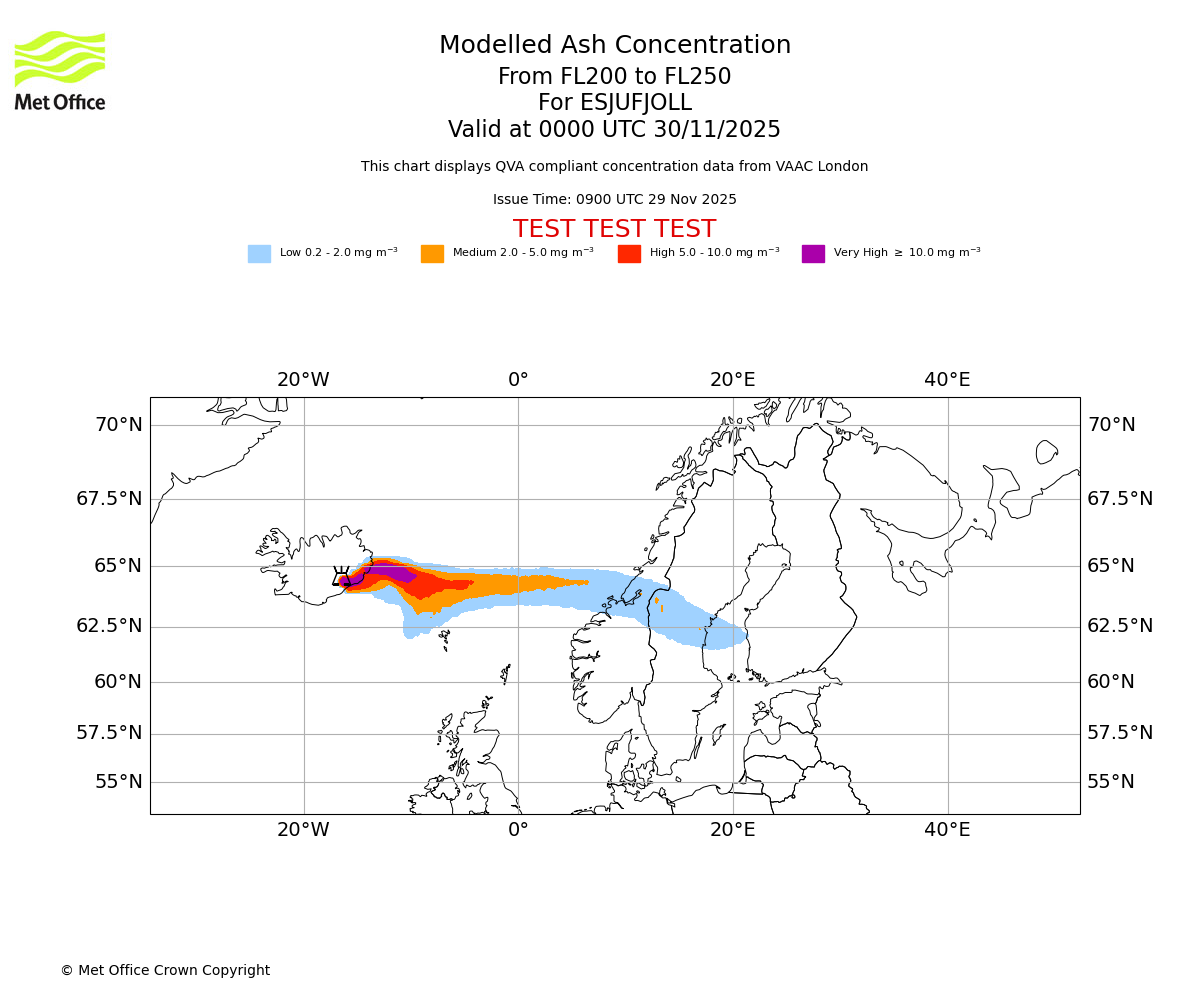 Modelled ash concentration from 000 to 200 for ESJUFJOLL. Valid at 0900 UTC 29/11/2025