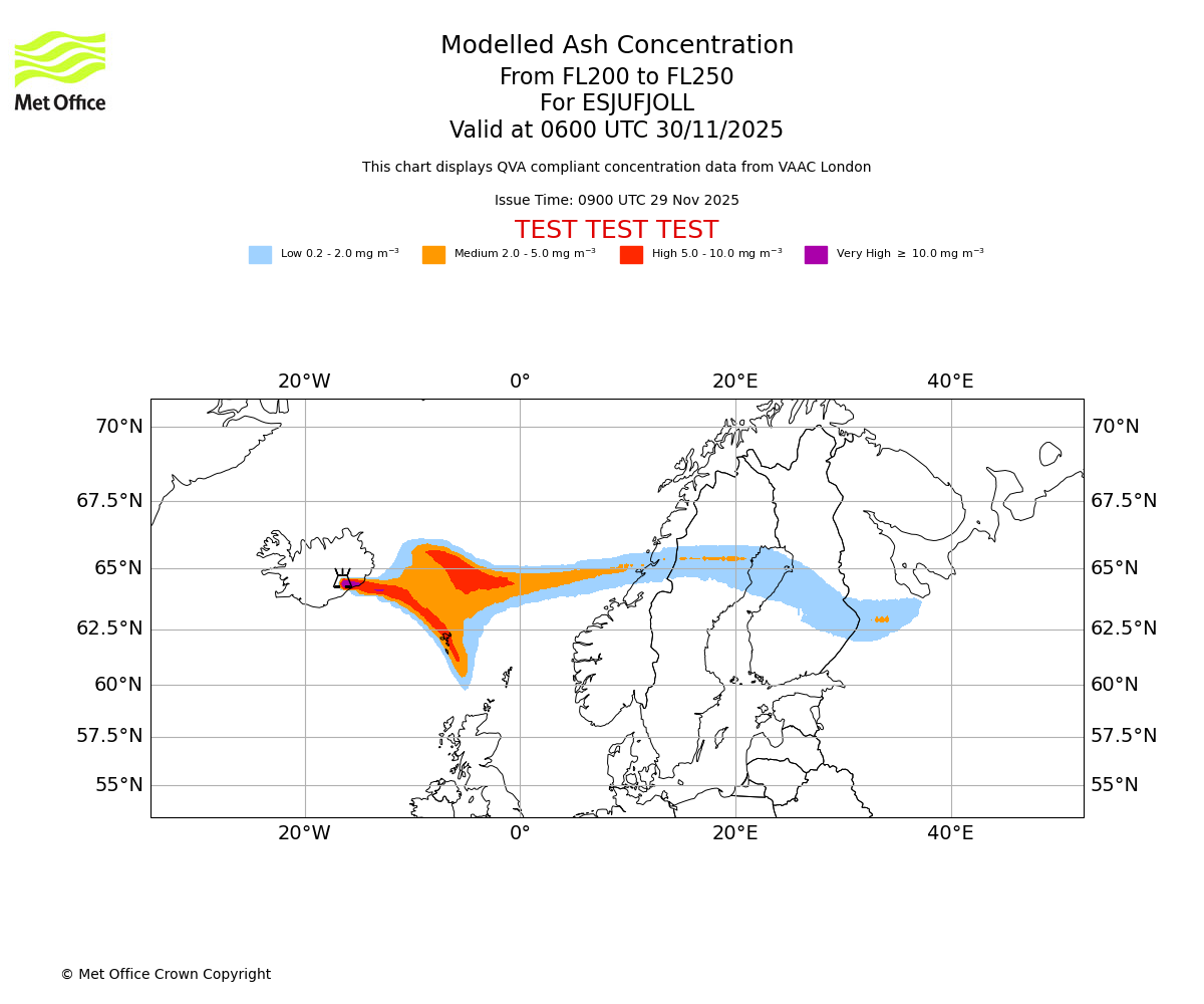 Modelled ash concentration from 000 to 200 for ESJUFJOLL. Valid at 0900 UTC 29/11/2025