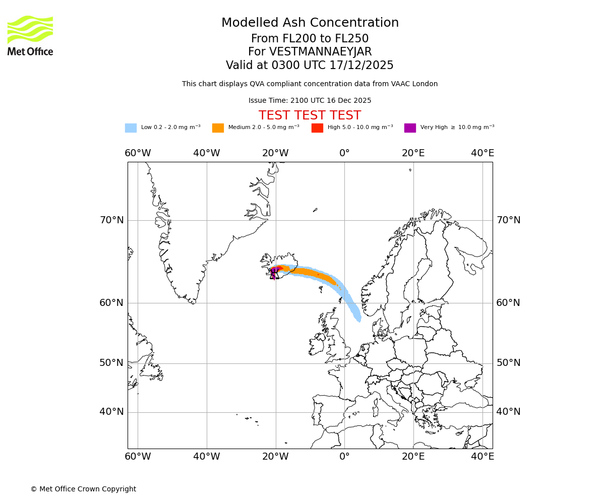 Modelled ash concentration from 000 to 200 for VESTMANNAEYJAR. Valid at 2100 UTC 16/12/2025