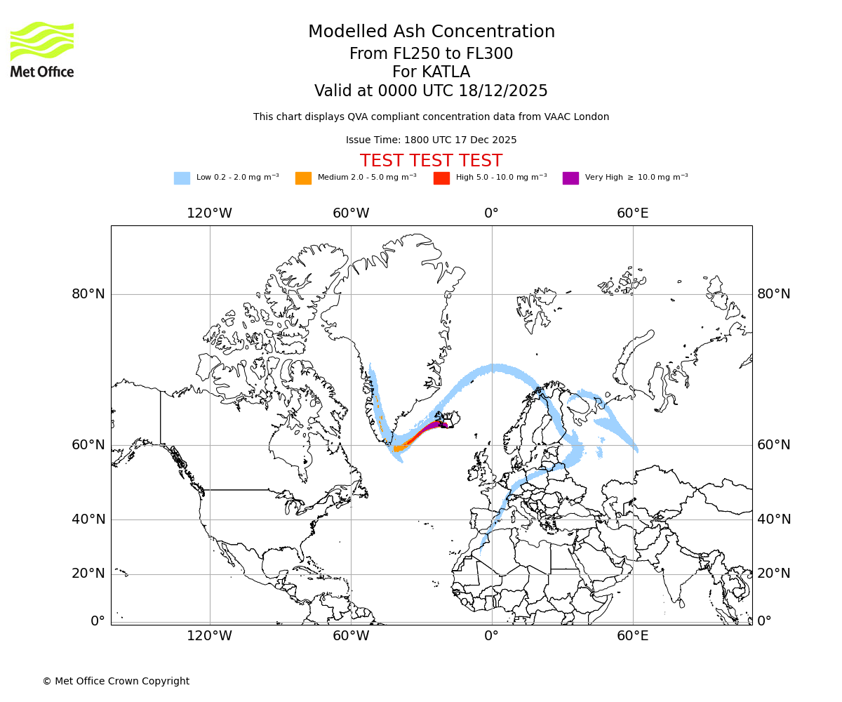 Modelled ash concentration from 000 to 200 for KATLA. Valid at 1800 UTC 17/12/2025