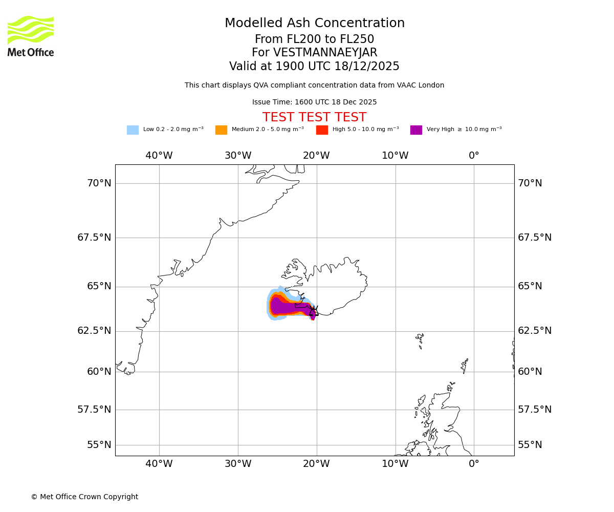 Modelled ash concentration from 200 to 250 for VESTMANNAEYJAR. Valid at 1600 UTC 18/12/2025