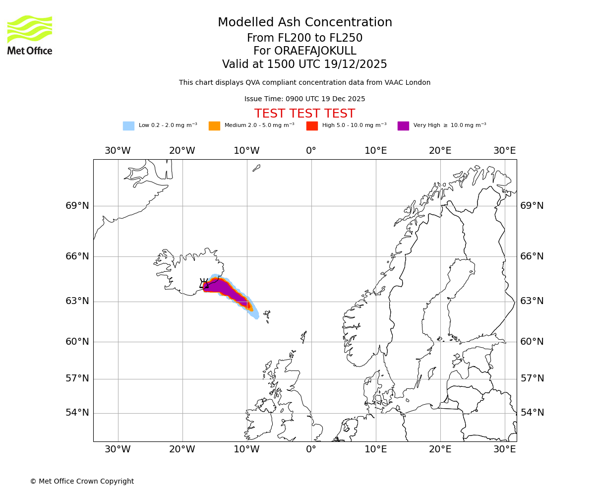 Modelled ash concentration from 200 to 250 for ORAEFAJOKULL. Valid at 1200 UTC 19/12/2025