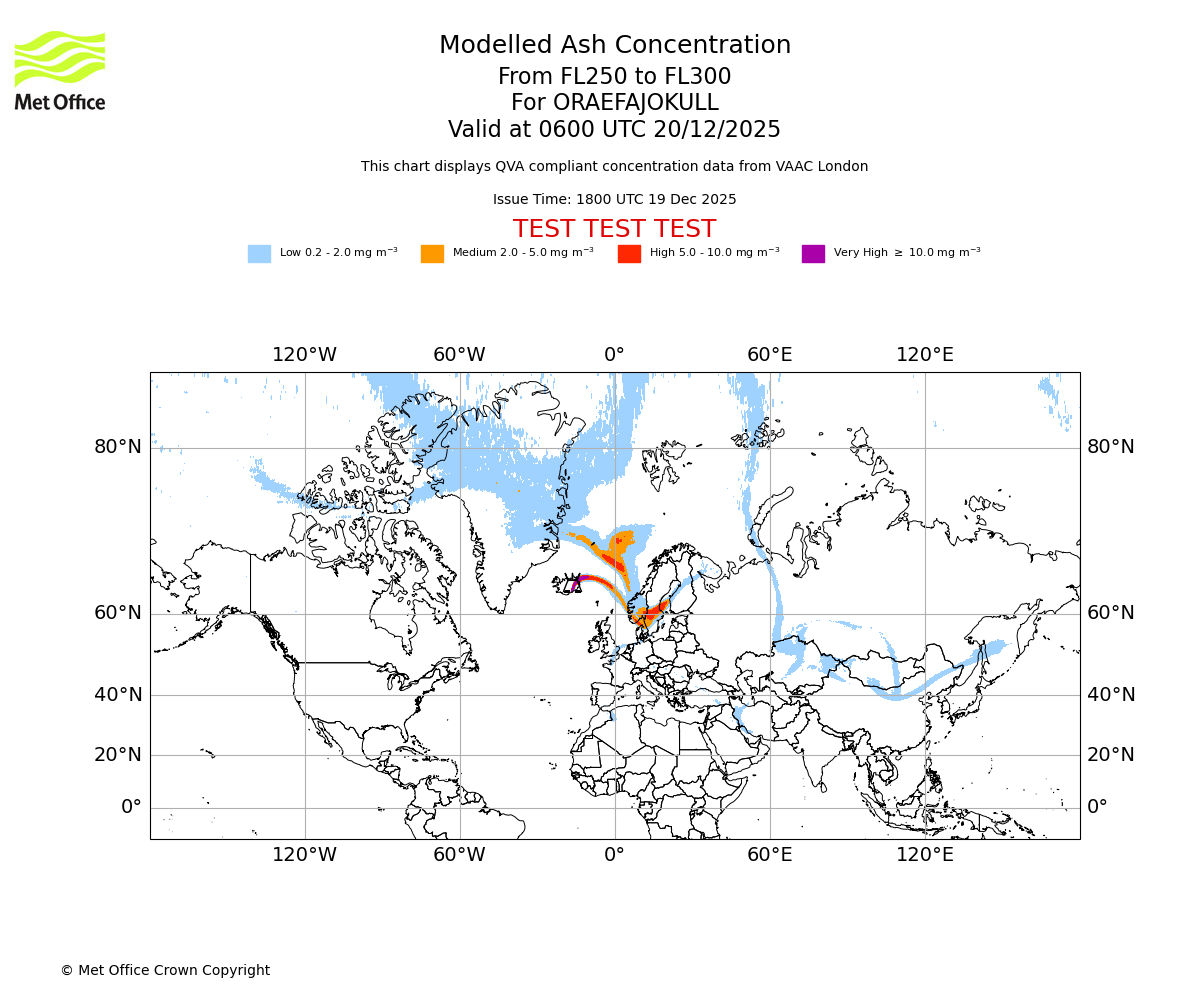 Modelled ash concentration from 200 to 250 for ORAEFAJOKULL. Valid at 0600 UTC 20/12/2025