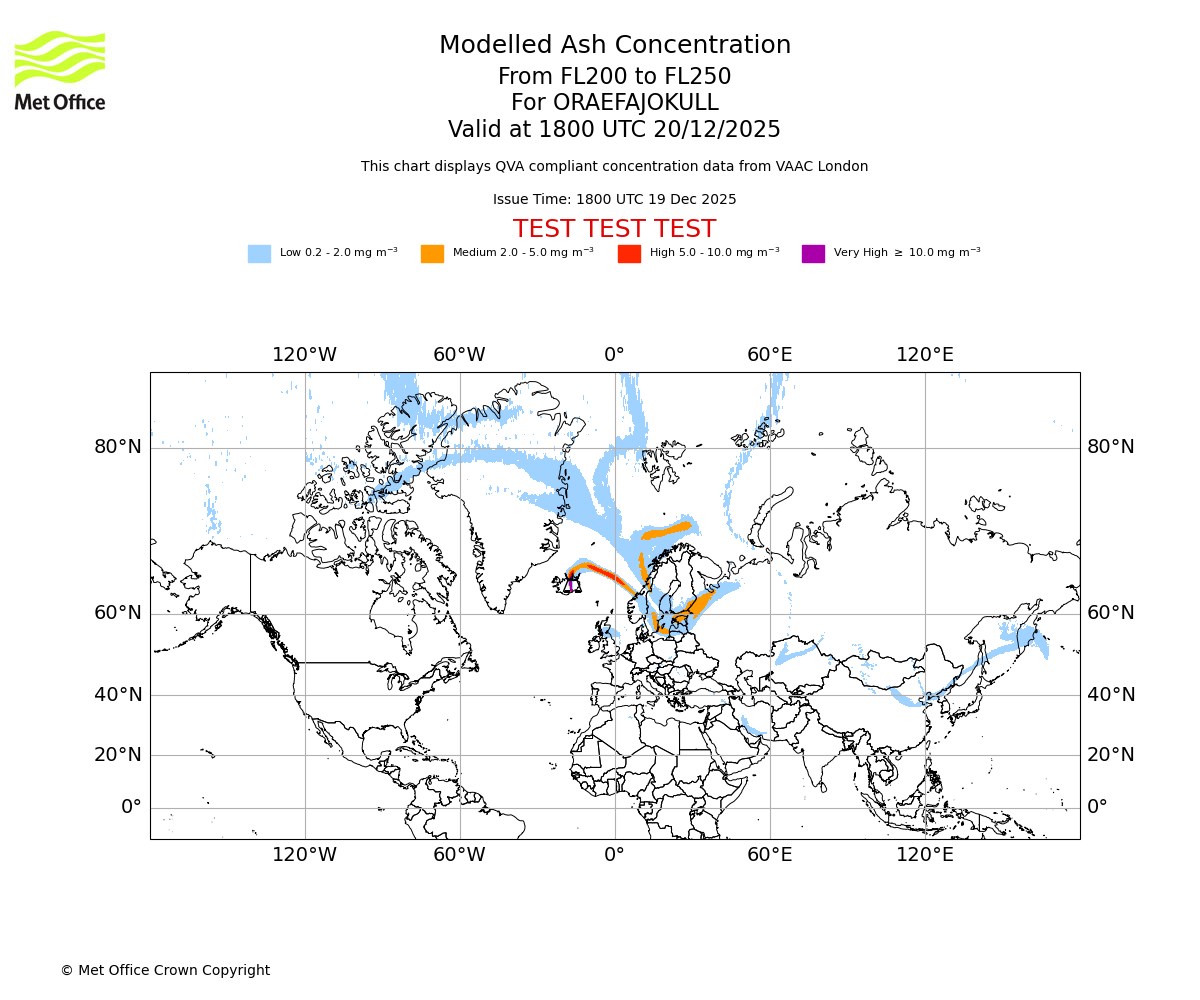 Modelled ash concentration from 000 to 200 for ORAEFAJOKULL. Valid at 1800 UTC 19/12/2025