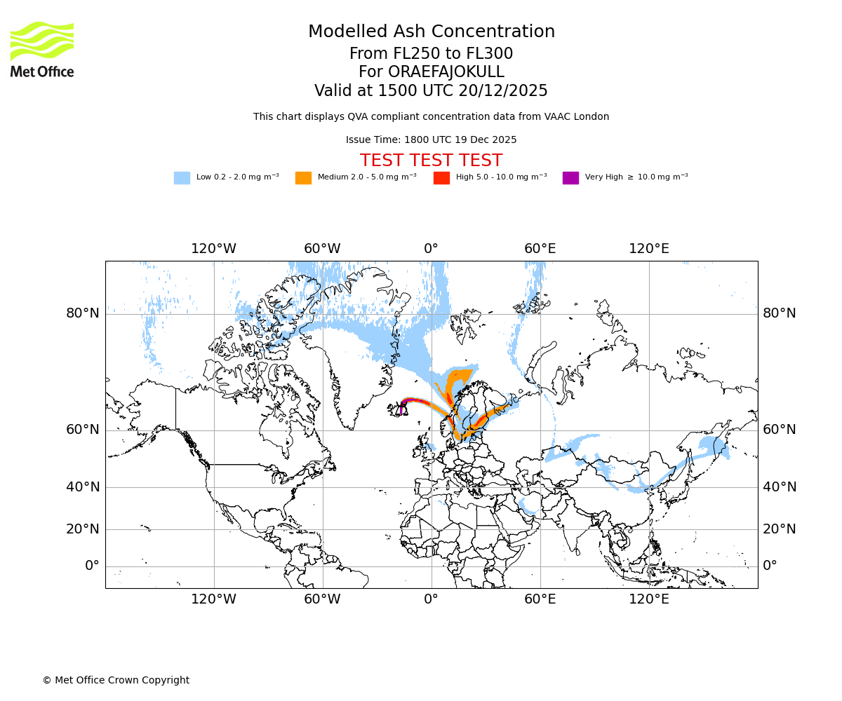 Modelled ash concentration from 200 to 250 for ORAEFAJOKULL. Valid at 1500 UTC 20/12/2025