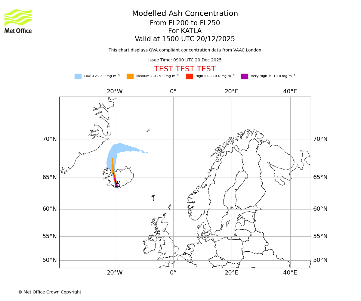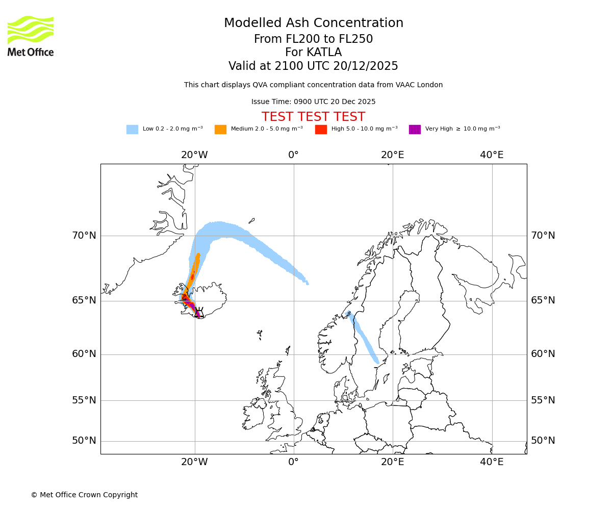 Modelled ash concentration from 000 to 200 for KATLA. Valid at 0900 UTC 20/12/2025